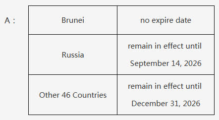 目前,中方對汶萊持普通護照人員的免簽政策未設施行期限,對俄羅斯持普通護照人員的免簽政策施行至2026年9月14日,對其餘46國持普通護照人員的免簽政策施行至2026年12月31日。