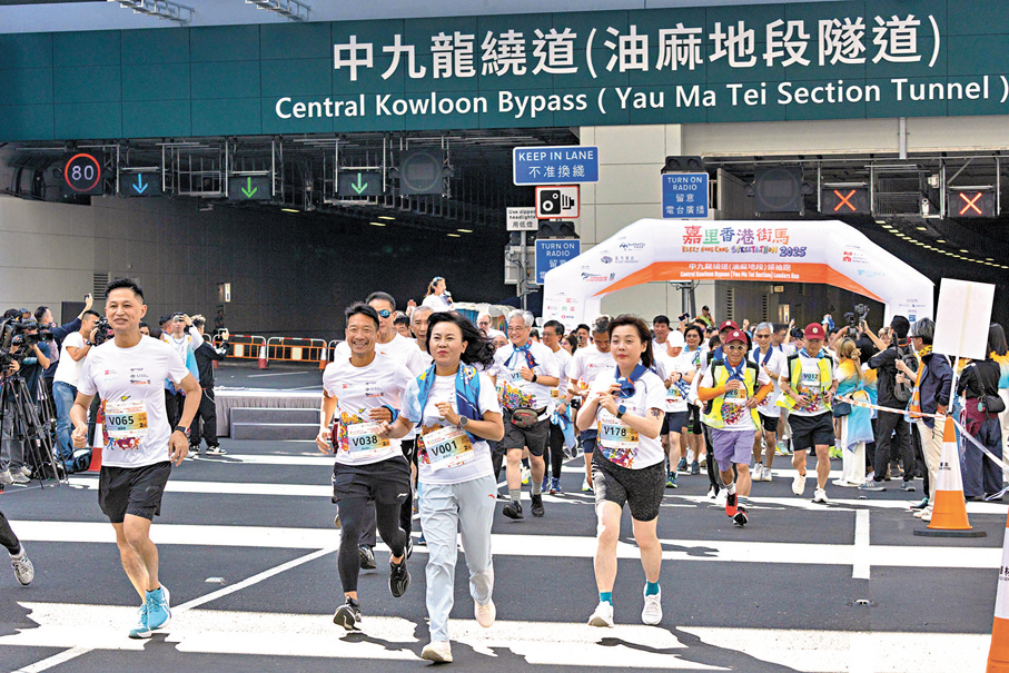 香港文匯報訊(記者 李芷珊)特區政府運輸及物流局局長陳美寶昨日連走兩場街馬活動,先在將軍澳為10公里挑戰組跑手鳴槍,之後再到中九龍繞道(油麻地段)參與「領袖跑」2公里賽事。她在「領袖跑」起步禮上致辭指出,趁中九龍繞道(油麻地段)籌備得如火如荼,可以藉參與全馬和半馬這個機會,讓跑手親身感受這個大型基建的工程。目前政府仍在努力興建茶果嶺隧道,期望明年再與籌辦街馬的社會企業「全城街馬」合作舉辦同類型賽事。