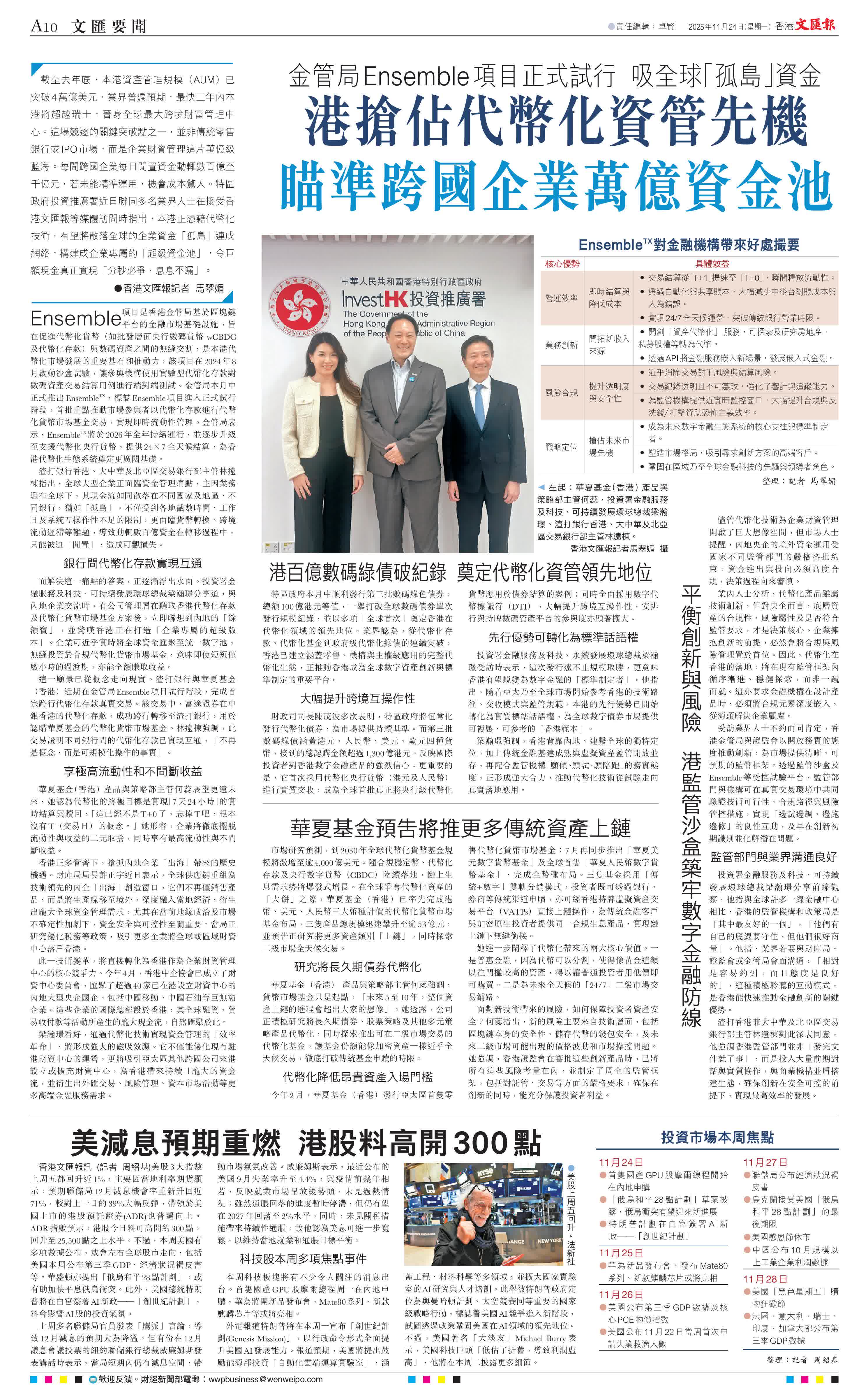 (香港文匯報記者 周紹基)美股3大指數上周五都回升近1%,主要因當地利率期貨顯示,預期聯儲局12月減息機會率重新升回近71%,較對上一日的39%大幅反彈,帶領於美國上市的港股預託證券(ADR)也普遍向上。ADR指數預示,港股今日料可高開約300點,回升至25,500點之上水平。不過,本周美國有多項數據公布,或會左右全球股市走向,包括美國本周公布第三季GDP、經濟狀況褐皮書等。華盛頓亦提出「俄烏和平28點計劃」,或有助加快平息俄烏衝突。此外,美國總統特朗普將在白宮簽署AI新政——「創世紀計劃」,料會影響AI股的投資氣氛。