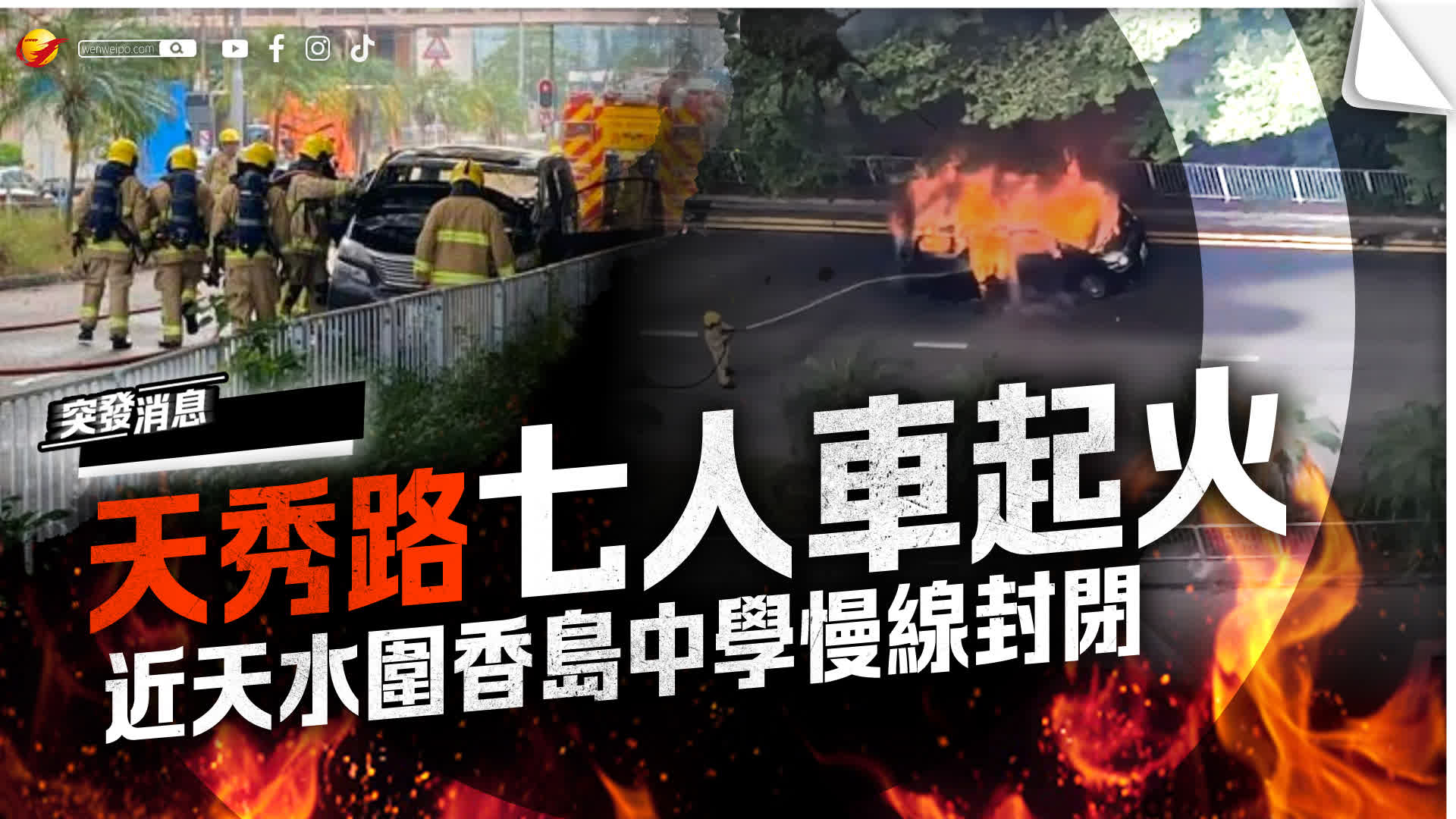 今日(24日)早上8時28分,天水圍天秀路近天水圍香島中學,一輛七人車行駛途中突然起火,司機及時跳車逃生並報警求助。消防接報到場,出動一條喉及一隊煙帽隊撲救,約10分鐘後將火救熄。事件無人受傷,起火原因仍在調查中。