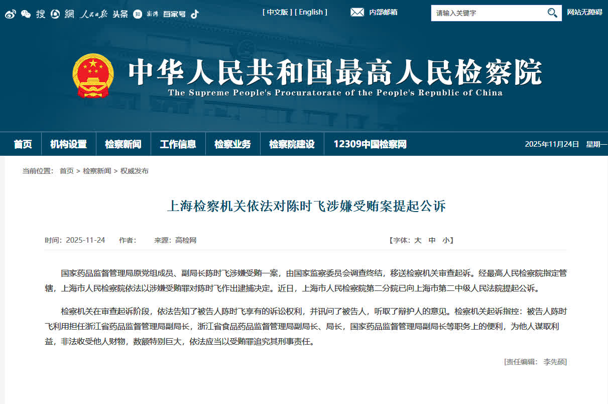 據最高人民檢察院,國家藥品監督管理局原黨組成員、副局長陳時飛涉嫌受賄一案,由國家監察委員會調查終結,移送檢察機關審查起訴。經最高人民檢察院指定管轄,上海市人民檢察院依法以涉嫌受賄罪對陳時飛作出逮捕決定。