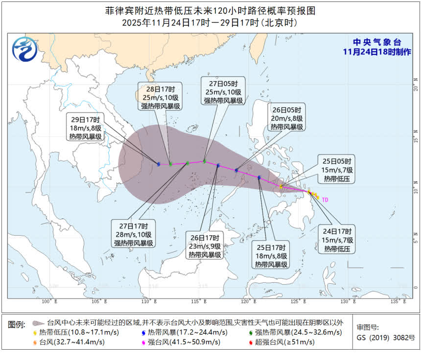 中央氣象台預計,該低壓將以每小時15至20公里的速度向西偏北方向移動,可能於未來24小時內加強為今年第27號颱風,並於25日夜間進入南海南部海域,強度緩慢加強,最強可達強熱帶風暴級(25至28米/秒,10級)。