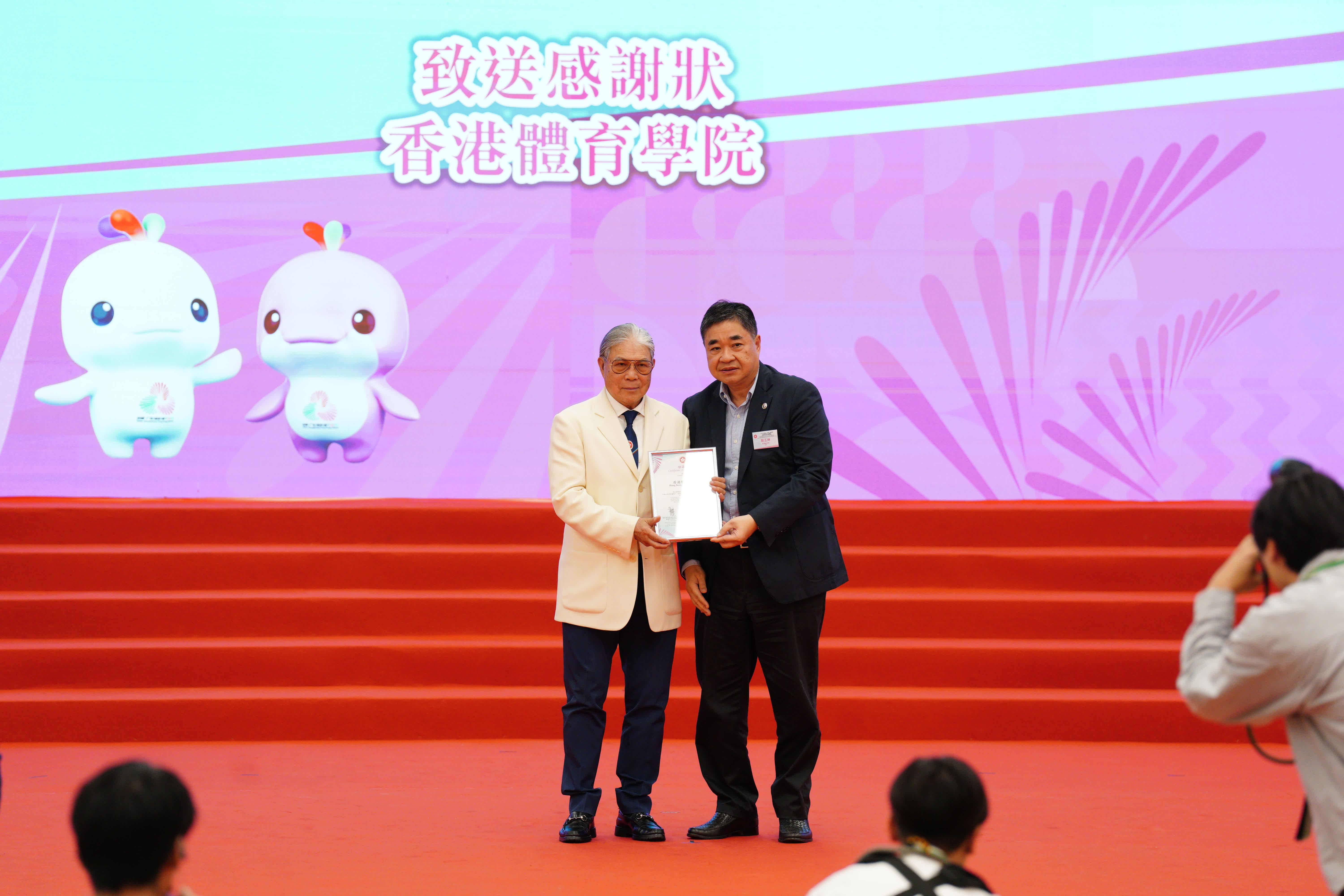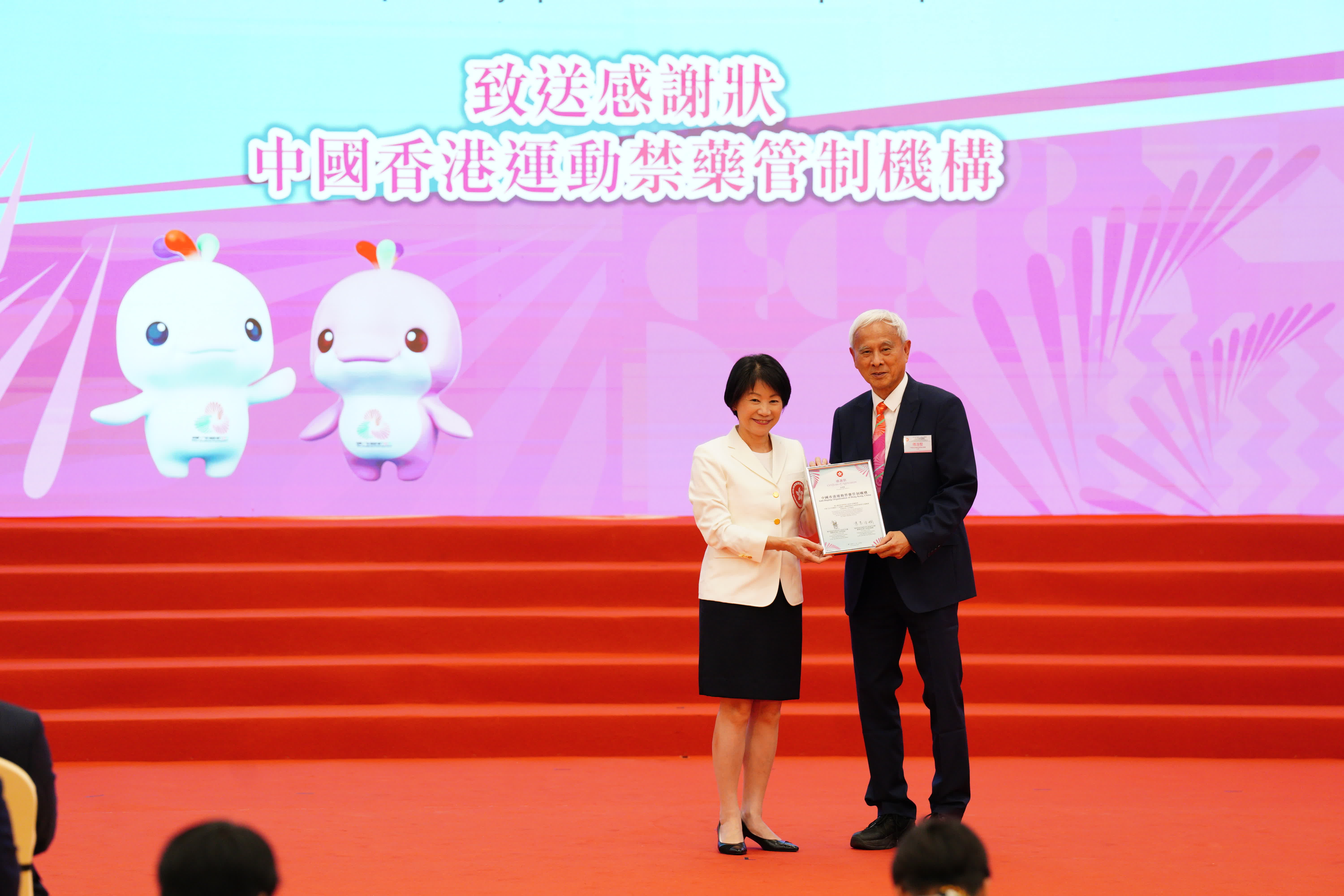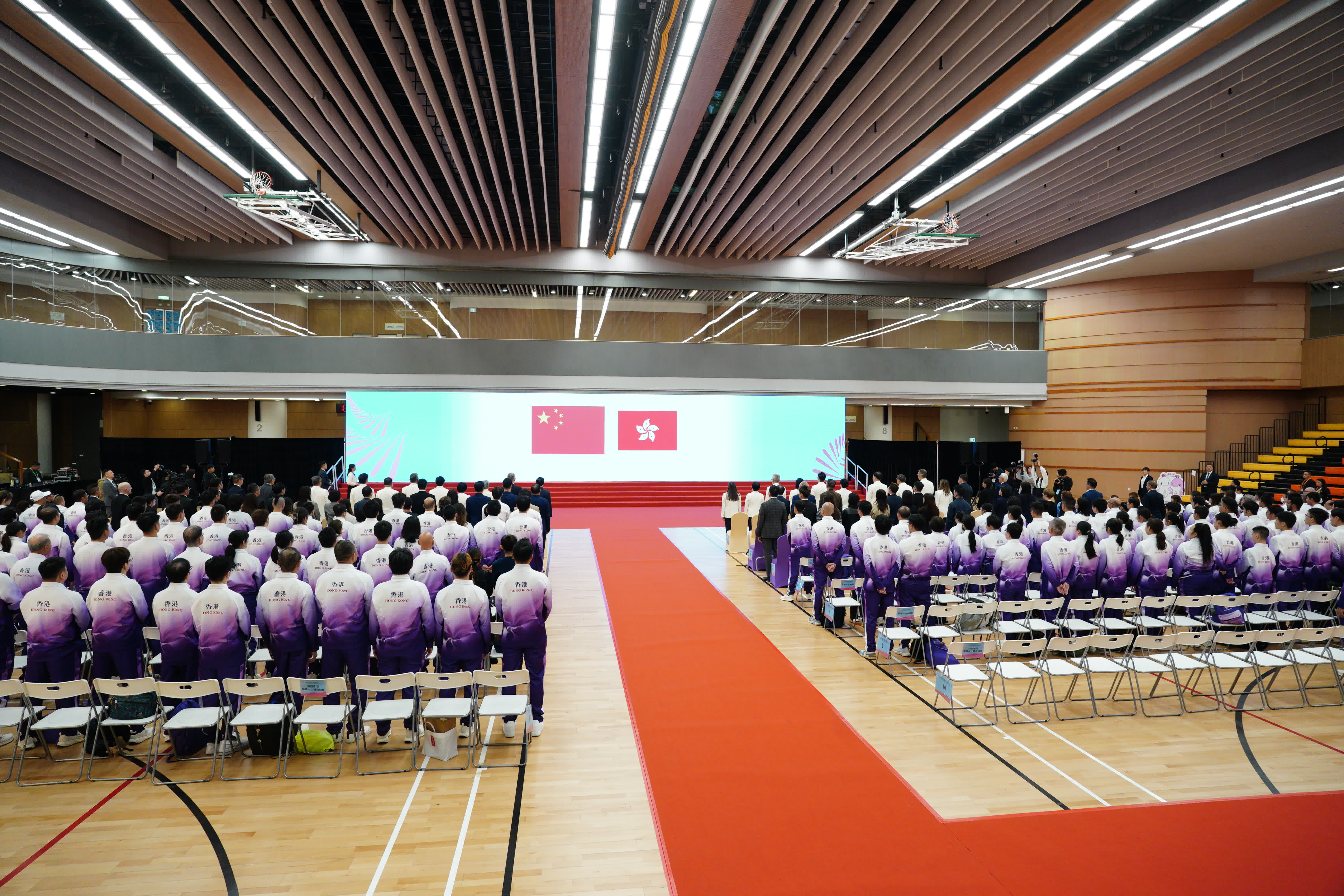 行政長官李家超主持授旗儀式,文化體育及旅遊局(文體旅局)局長兼香港特區代表團團長羅淑佩代表接受特區區旗。
