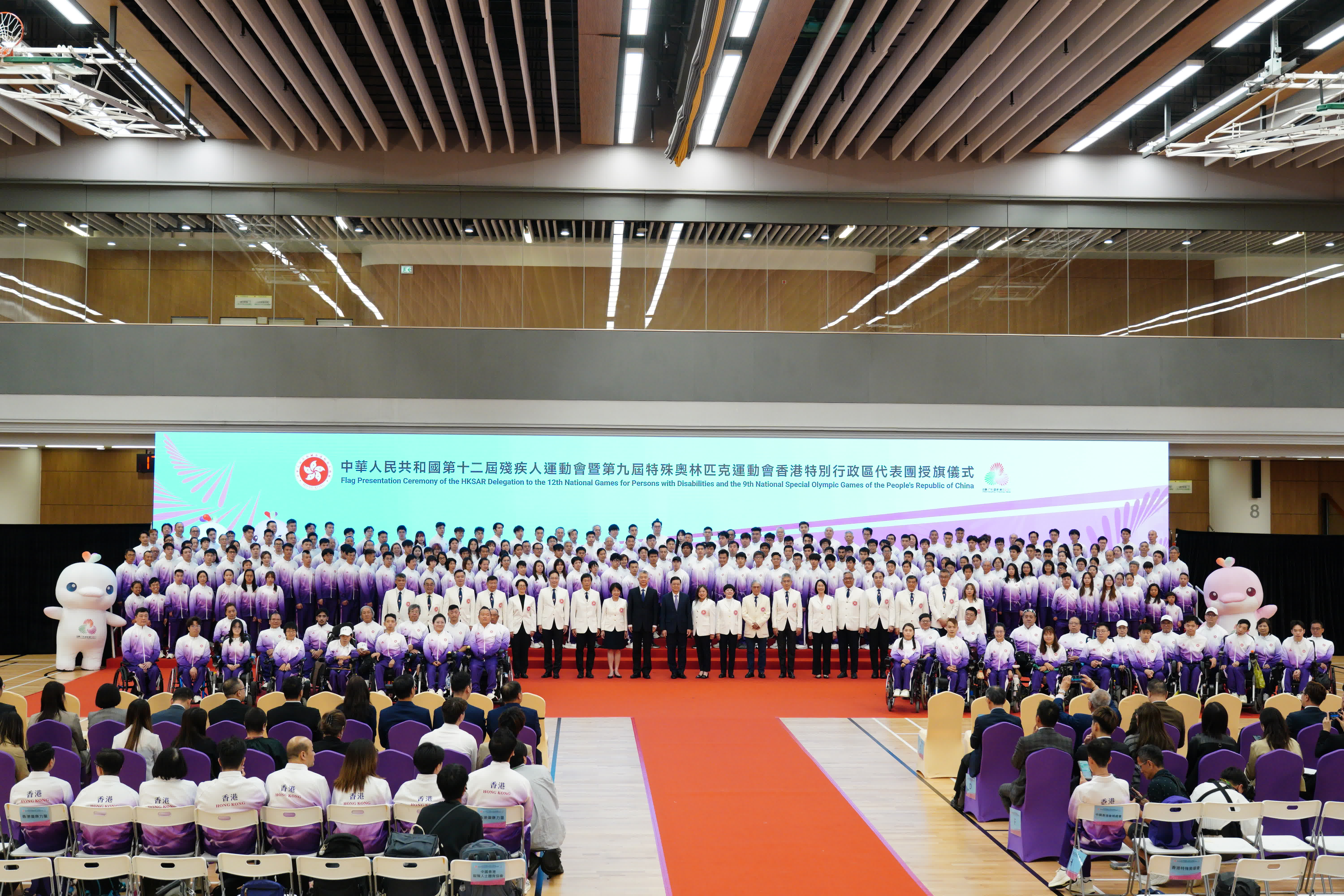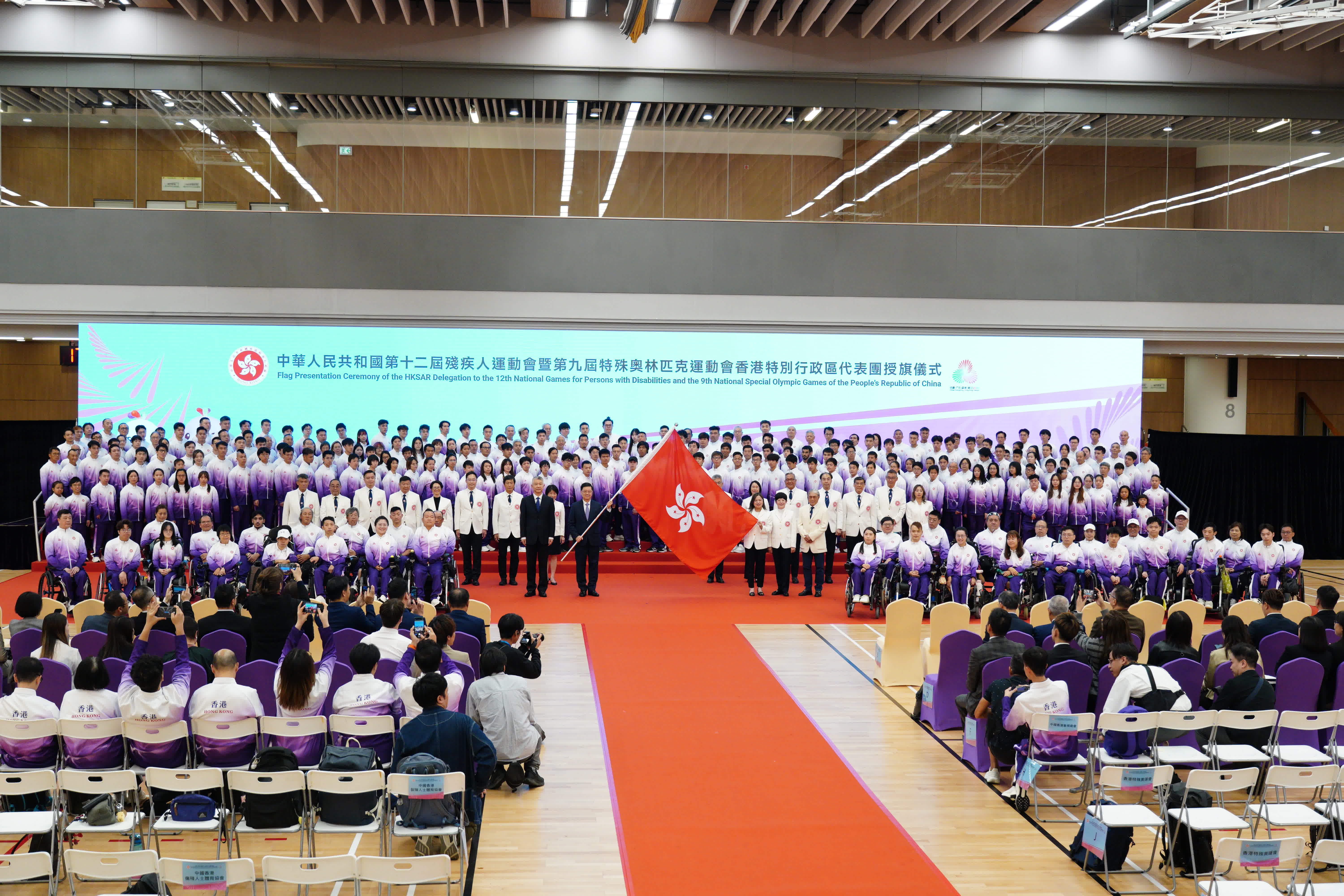 (大公文匯全媒體報道)第十二屆殘疾人運動會(殘運會)暨第九屆特殊奧林匹克運動會(特奧會)(合稱殘特奧會)香港特別行政區(特區)代表團授旗儀式,今日(24日)下午在調景嶺體育館舉行,行政長官李家超主持授旗儀式。其他主要嘉賓包括中央人民政府駐港聯絡辦副主任孫尚武、文化體育及旅遊局(文體旅局)局長兼香港特區代表團團長羅淑佩、中國香港殘疾人奧委會會長兼代表團籌備委員會(籌委會)主席馮馬潔嫻、中國香港體育協會暨奧林匹克委員會會長兼籌委會主席霍震霆等。