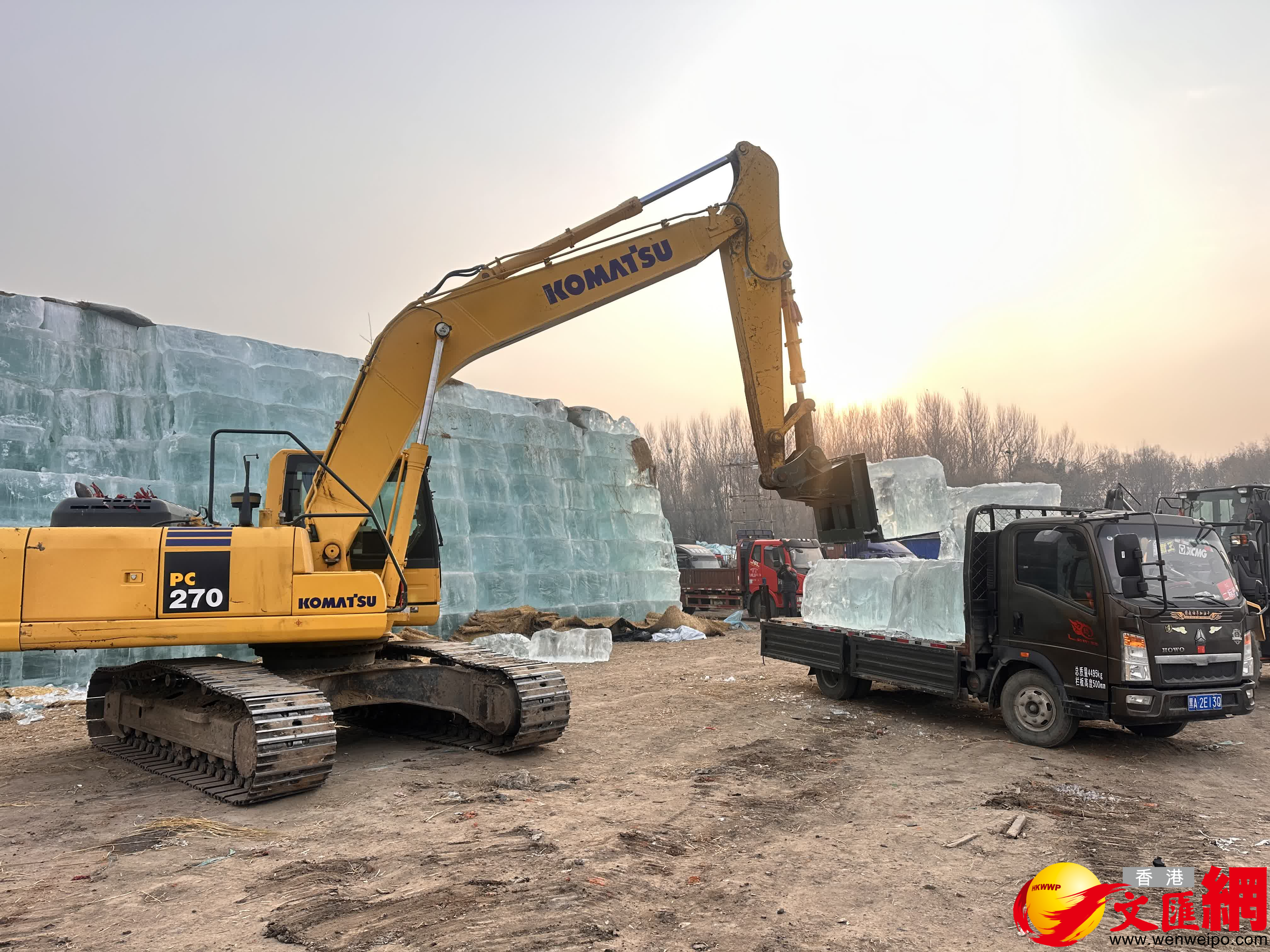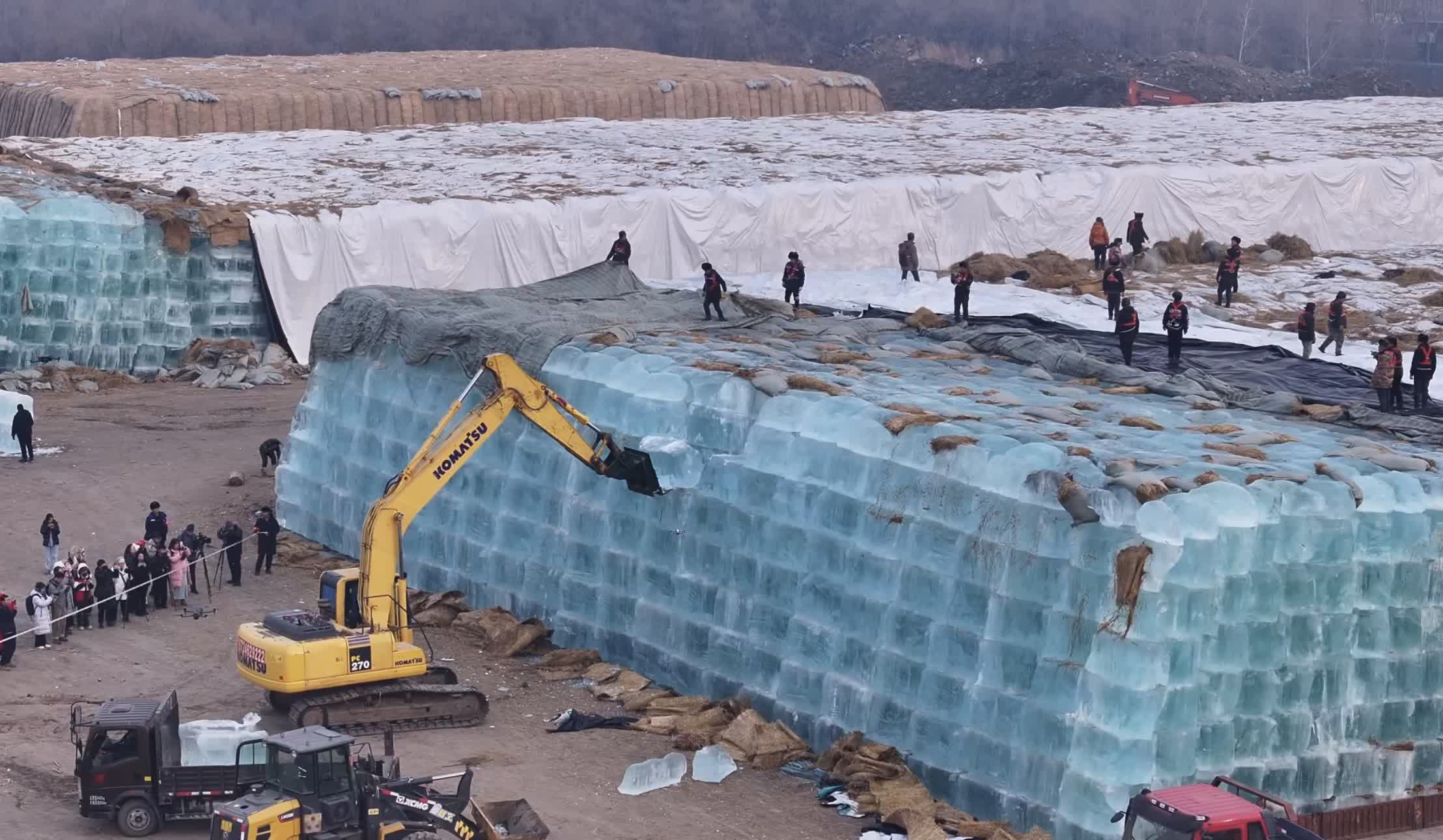 下午14時30分,哈爾濱冰雪大世界存冰場內,作業車輛在冰垛間忙碌穿梭。隨着吊車、鏟車、叉車接力作業,冰垛上的冰體被一塊塊拆解下來。