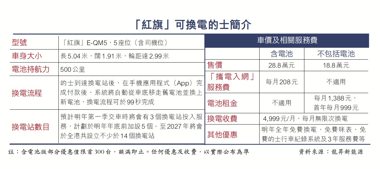 他補充,預計與明年第一季交車,現時已接獲的士意向性訂單300輛。此外,他說明銷售模式分為「整車購買」與「車電分離」兩種方案,後者可透過電池租賃降低車主前期成本。