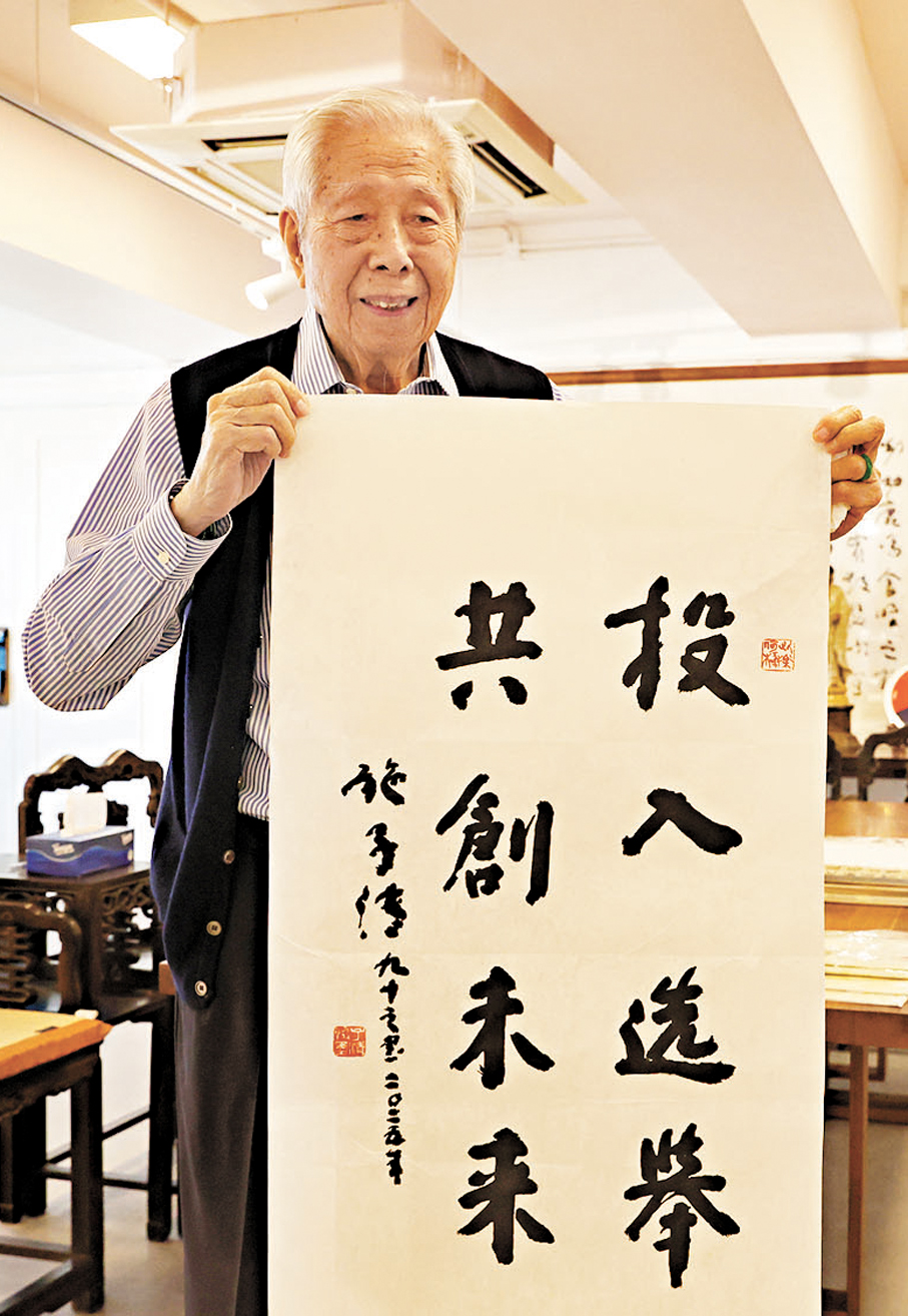 香港文匯報訊(記者 文禮願)臨近12月7日立法會選舉日,各界紛紛以不同方式鼓勵選民積極投票。大紫荊勳賢、中國書協香港分會主席施子清近日接受香港文匯報訪問時,即席揮毫以書法表達對選舉的重視,呼籲市民珍惜手中的一票,「選出賢能之士,為香港的未來出一分力。」