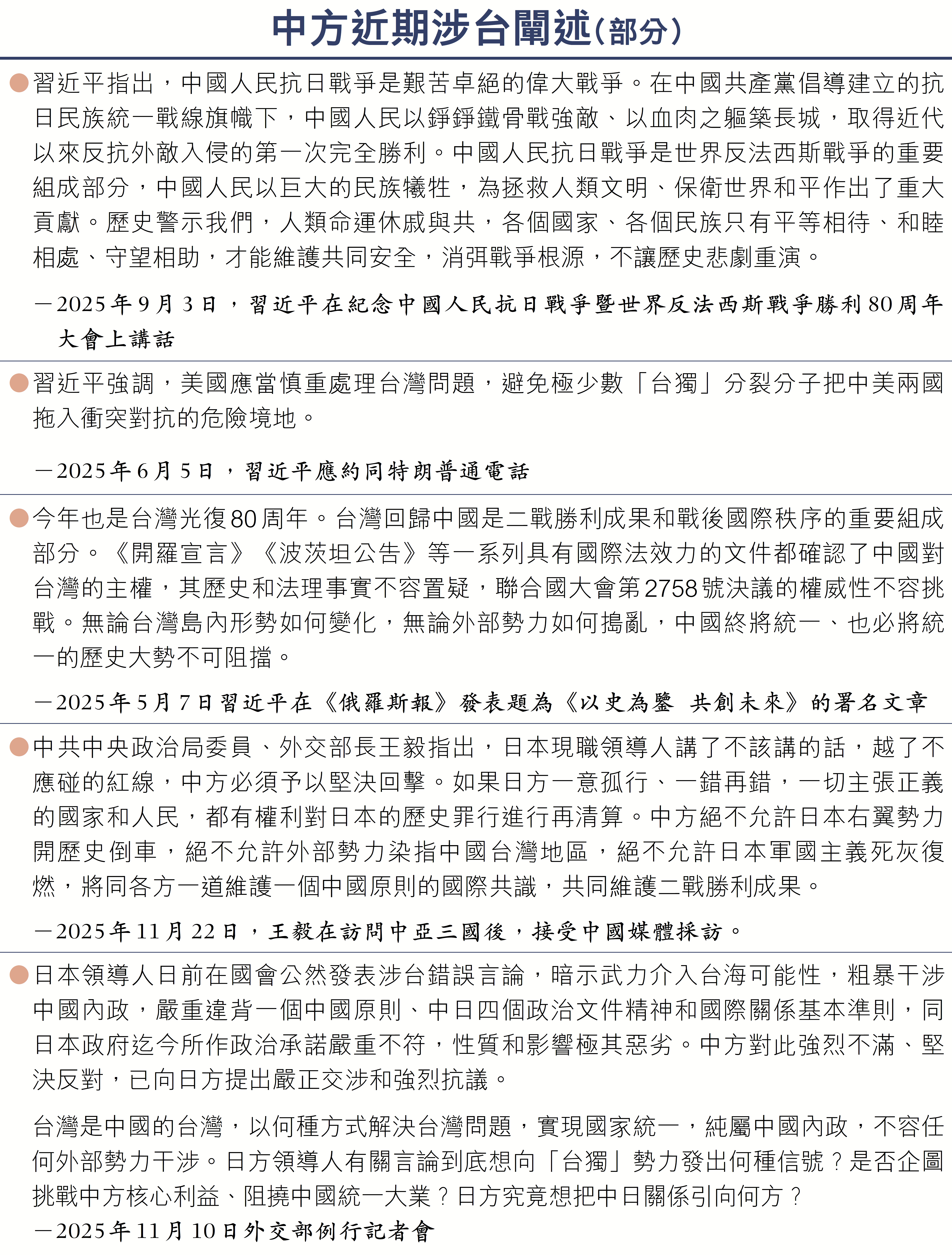 習近平闡明了中方在台灣問題上的原則立場,強調台灣回歸中國是戰後國際秩序重要組成部分。中美曾並肩抗擊法西斯和軍國主義,當前更應該共同維護好二戰勝利成果。