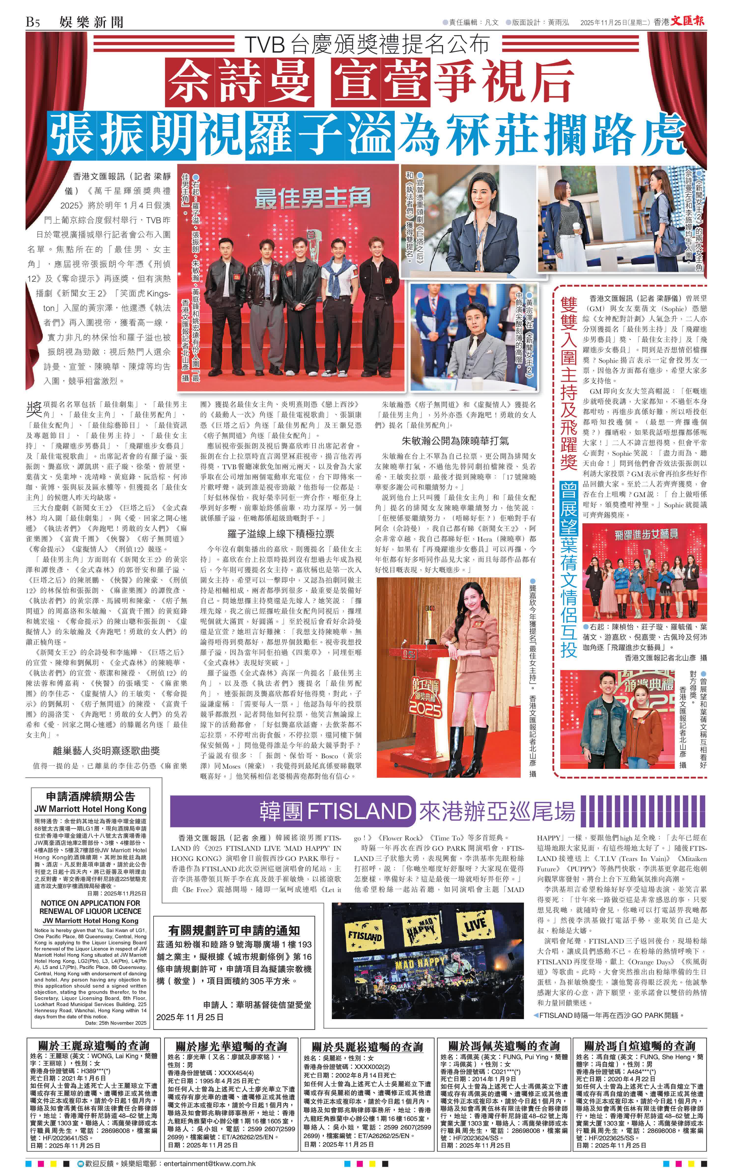 香港文匯報訊(記者 梁靜儀)《萬千星輝頒獎典禮2025》將於明年1月4日假澳門上葡京綜合度假村舉行,TVB昨日於電視廣播城舉行記者會公布入圍名單。焦點所在的「最佳男、女主角」,應屆視帝張振朗今年憑《刑偵12》及《奪命提示》再逐獎,但有演熱播劇《新聞女王2》「笑面虎Kingston」入屋的黃宗澤,他還憑《執法者們》再入圍視帝,獲看高一線,實力非凡的林保怡和羅子溢也被振朗視為勁敵;視后熱門人選佘詩曼、宣萱、陳曉華、陳煒等均告入圍,競爭相當激烈。