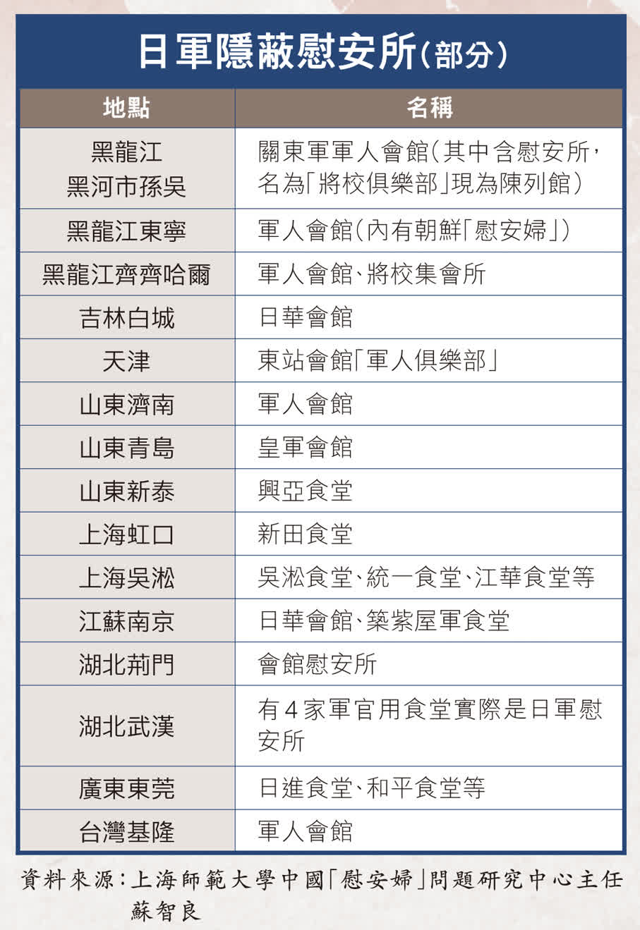 上海師範大學中國「慰安婦」問題研究中心主任蘇智良接受香港文匯報新聞調查部採訪時表示,侵華日軍慰安所名目繁多,有會館、食堂、酒吧、俱樂部、集會所等。在黑龍江、吉林、天津、山東、湖北、台灣、上海、南京、東莞、武漢等地均有案例證實其存在性奴役女性的情況。「所以許多慰安所名稱是遮人耳目,帶有欺騙性質的。」蘇智良說。