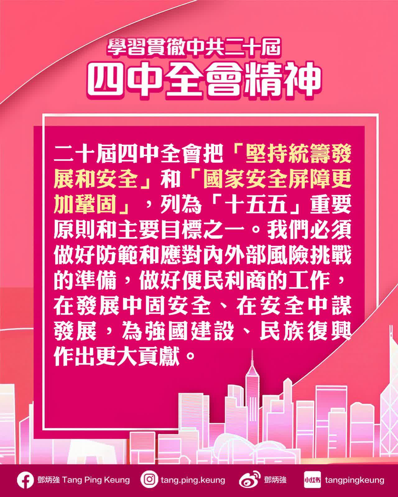 保安局局長鄧炳強今日(25日)於社交平台發文,指昨天(24日)出席由中央宣講團主講的中共二十屆四中全會精神宣講會,自己深受啟發。鄧炳強表示,作為保安局局長,他將與保安局及轄下各紀律部隊,深入學習和貫徹四中全會精神,增強憂患意識,堅持底線思維,做好防範和應對內外部風險挑戰的準備,同時勇於擔當、主動作為,全力做好便民利商的工作,以配合特區政府招商引才的措施,發揮香港國際金融、航運、貿易中心的優勢,為強國建設、民族復興作出更大貢獻。