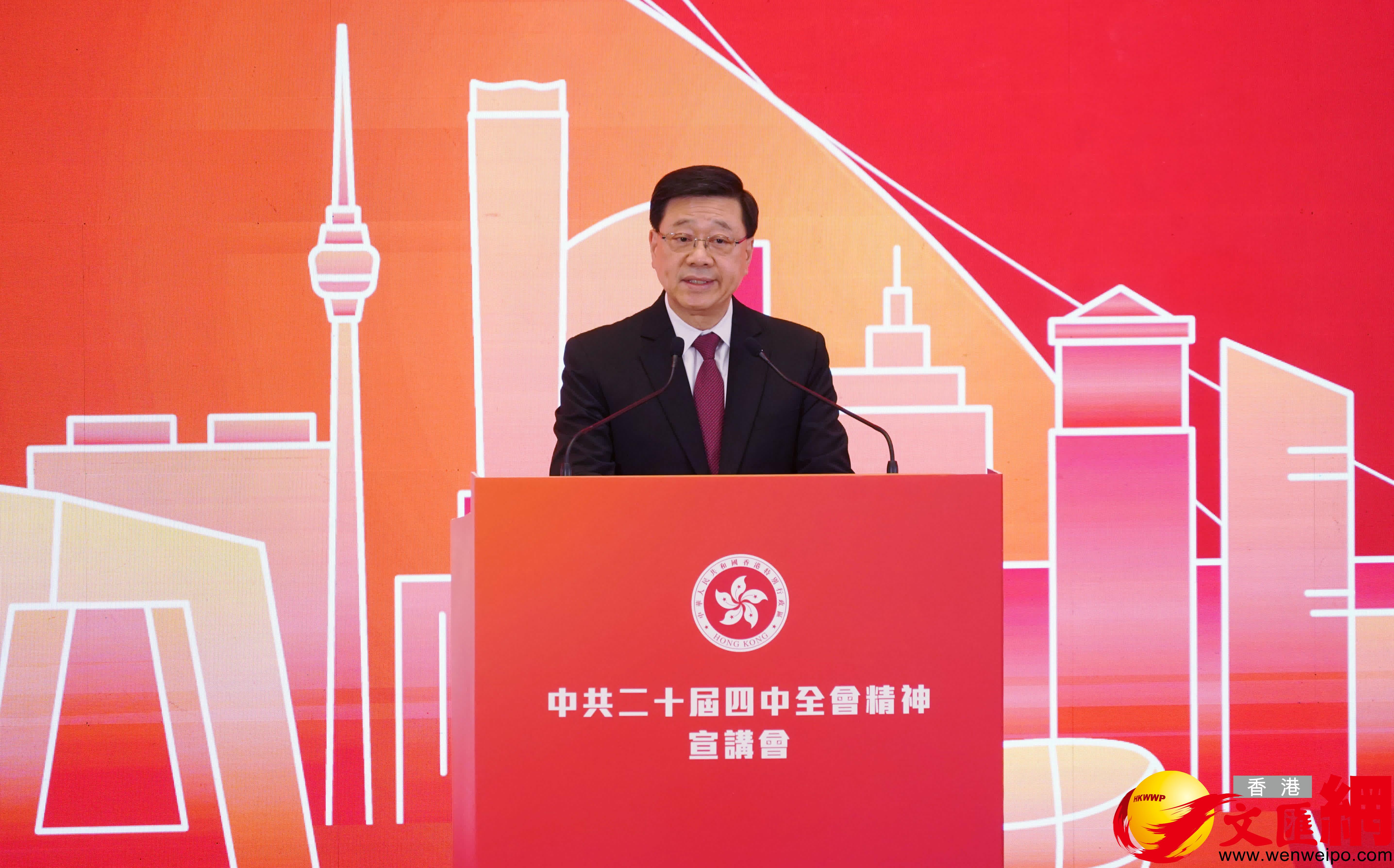 香港文匯報訊(記者 黃子晉)應香港特別行政區政府請求,經中央批准,中央港澳工作辦公室、國務院港澳事務辦公室邀請中央宣講團成員,中國科學院院長、黨組書記侯建國和中央宣講團成員,中央財經委員會辦公室副主任、中央農村工作領導小組辦公室副主任祝衛東來港宣講中共二十屆四中全會精神。香港特區政府今天(25日)早上在政府總部舉辦第二場中共二十屆四中全會精神宣講會。香港特區行政長官李家超在會上致歡迎詞時表示,衷心感謝中央對香港的關心和支持,應特區政府的請求,經中央批准,中央港澳辦、國務院港澳辦邀請,中央宣講團成員來港宣講中共二十屆四中全會精神,充分體現了中央對香港的高度重視和殷切關懷。