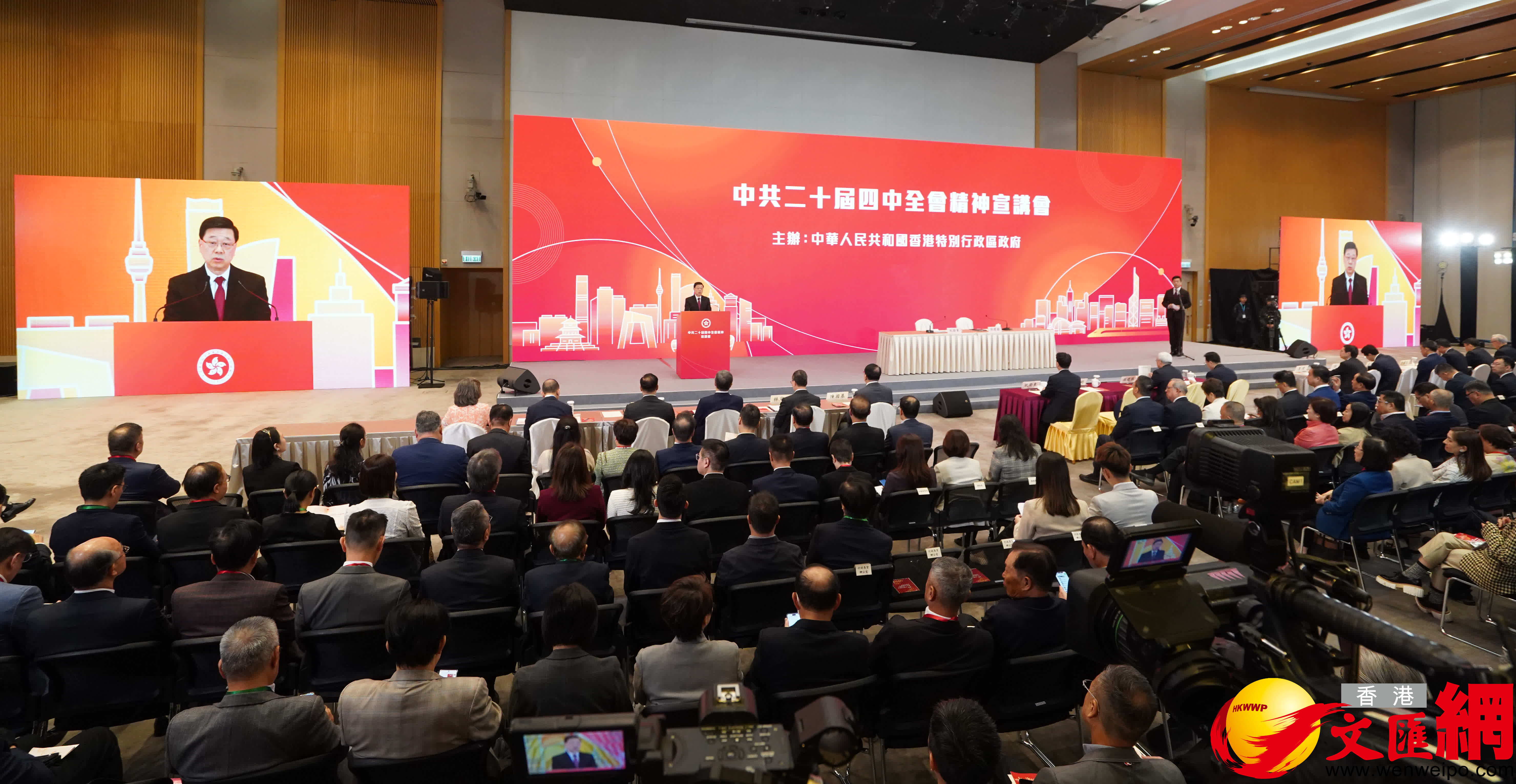 李家超表示,全會上月在北京勝利閉幕後,自己便組織了特區政府團隊研習會與司局長等主要官員一同學習全會精神。今天中央宣講團在香港作主講,自己和在座各位都熱切期待侯建國和祝衛東兩位重量級主講嘉賓的精闢講解和深入分析。