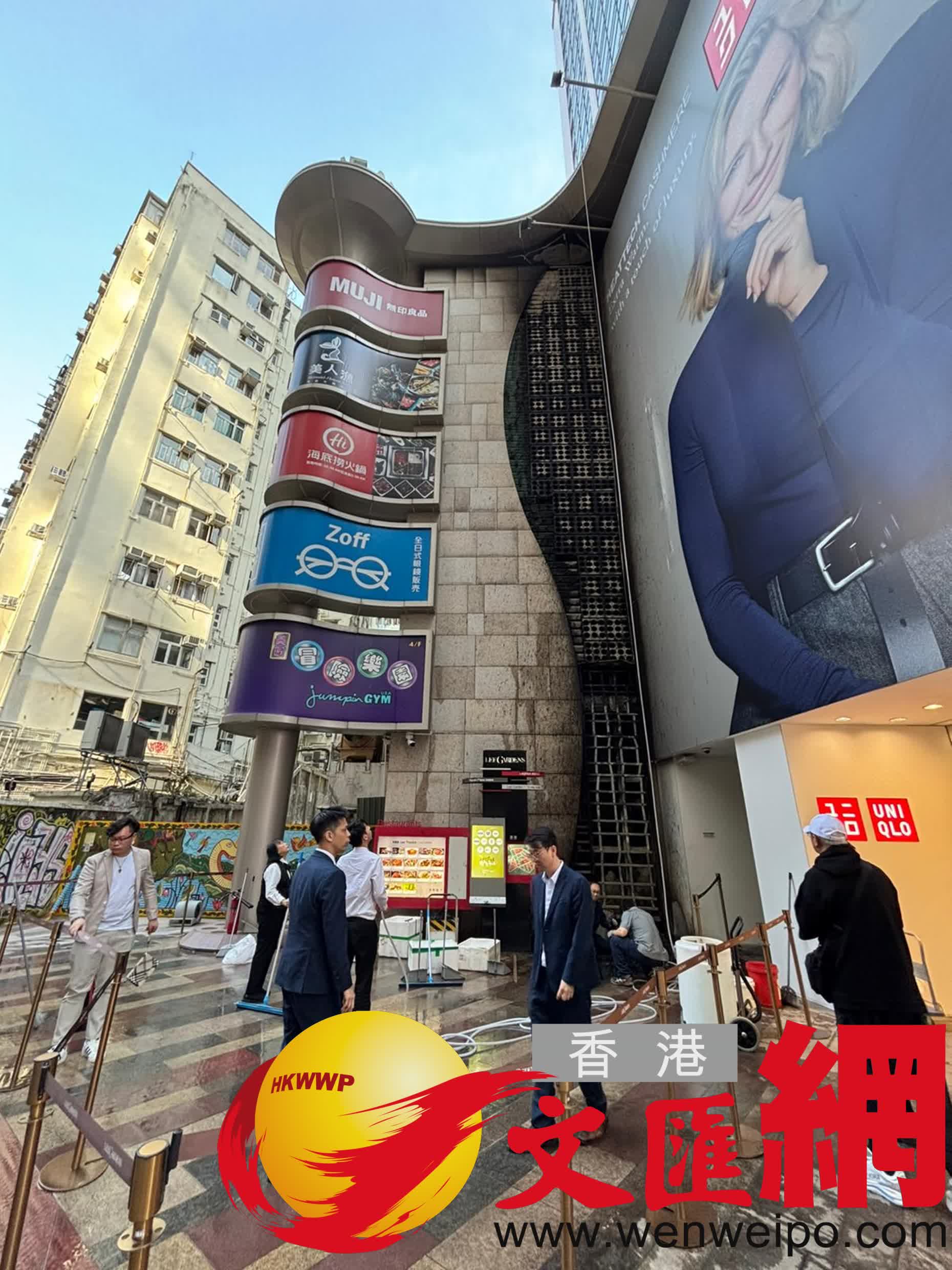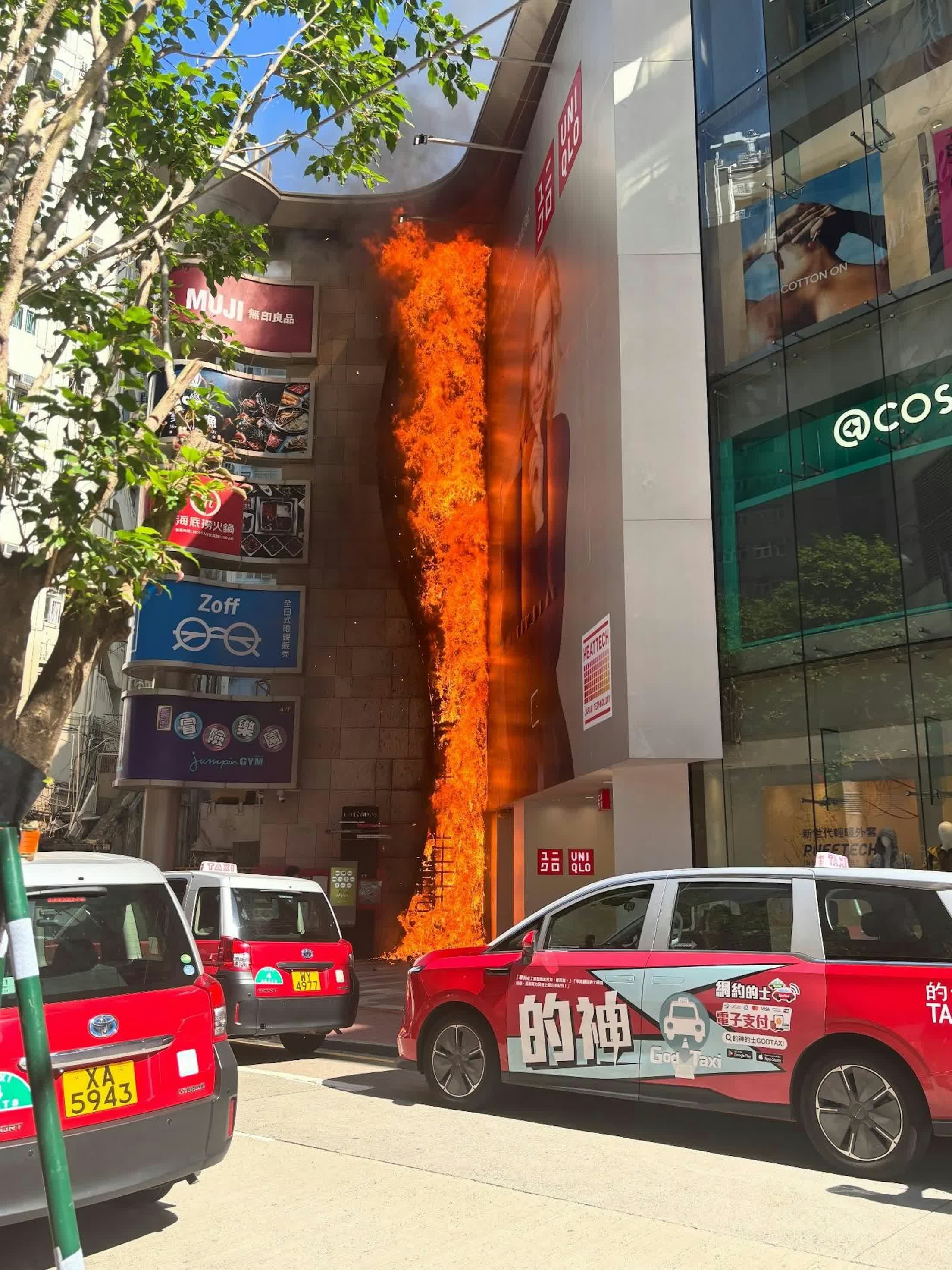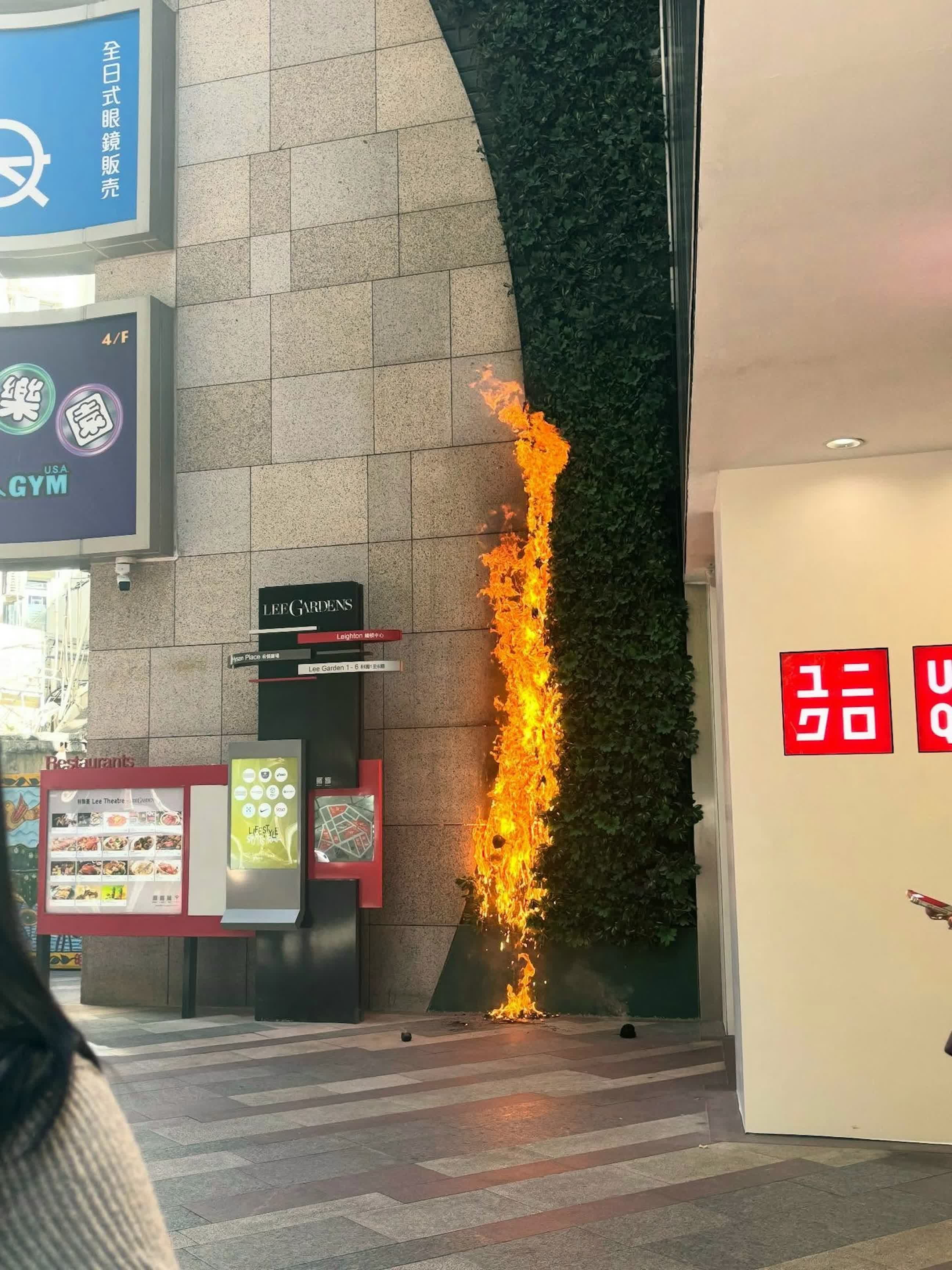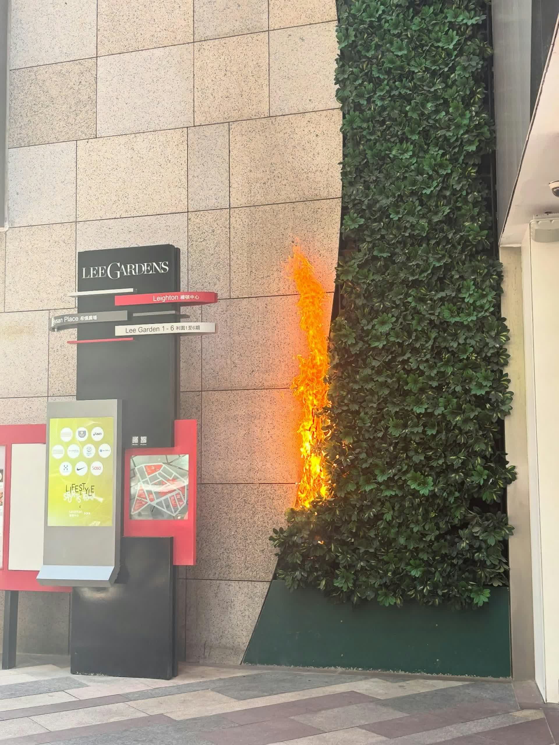 香港文匯報訊(記者 蕭景源)銅鑼灣波斯富街利舞臺廣場外牆,今日(25日)中午12時53分發生沖天大火,消防灌救約50分鐘後將火救熄,事後證實是舖設的人造草牆起火。由目擊者事後在網上發布照片可見,草牆右邊近下方位置首先起火,火勢起初不大,但很快愈燒愈烈,不斷向上蔓延,3分鐘內已向上蔓延數層樓高,外牆整幅人造草牆陷入一片火海。