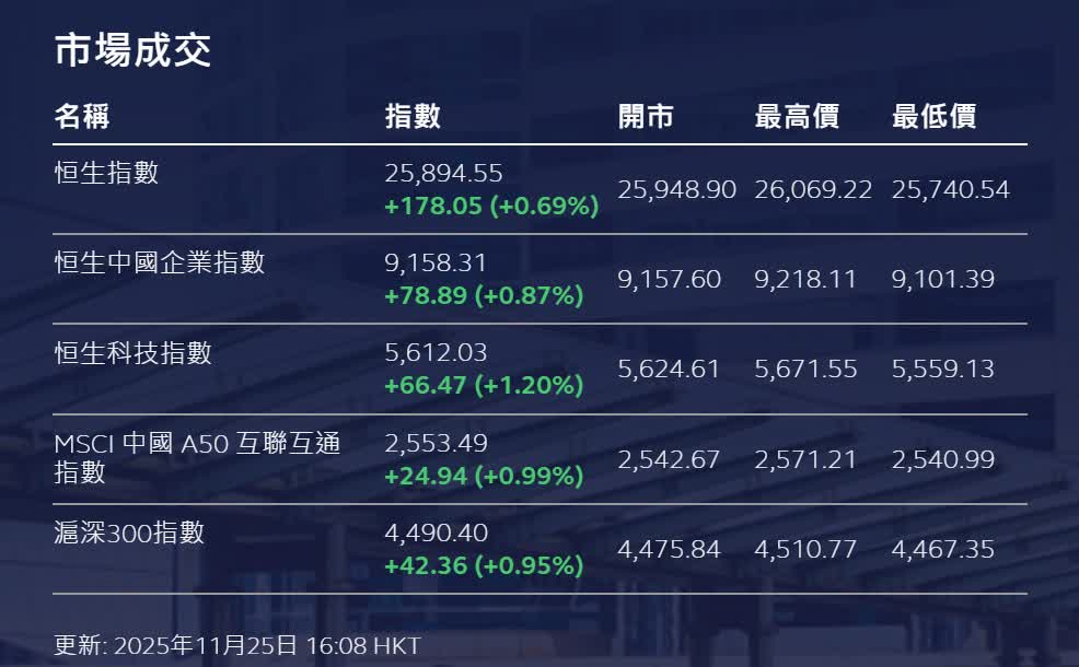 香港文匯報 港股今早延續周一強勢,恒生指數一度突破26,000點水平,隨後在沽壓加大下,三大指數仍齊齊報升。恒指收報25,894點,升178點或0.69%。國企指數升0.87%。恒生科技指數升1.2%。大市成交達2,311億元。