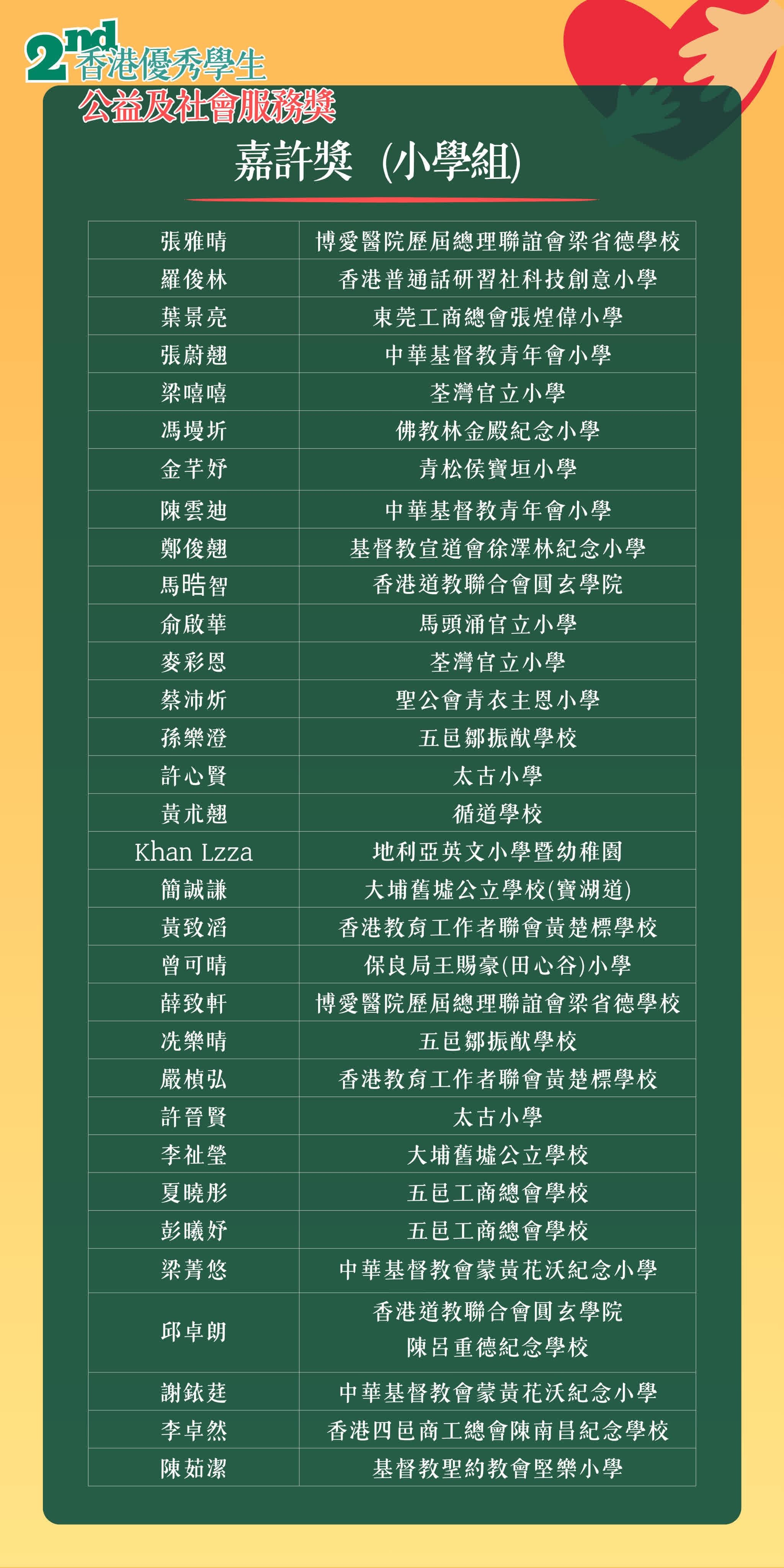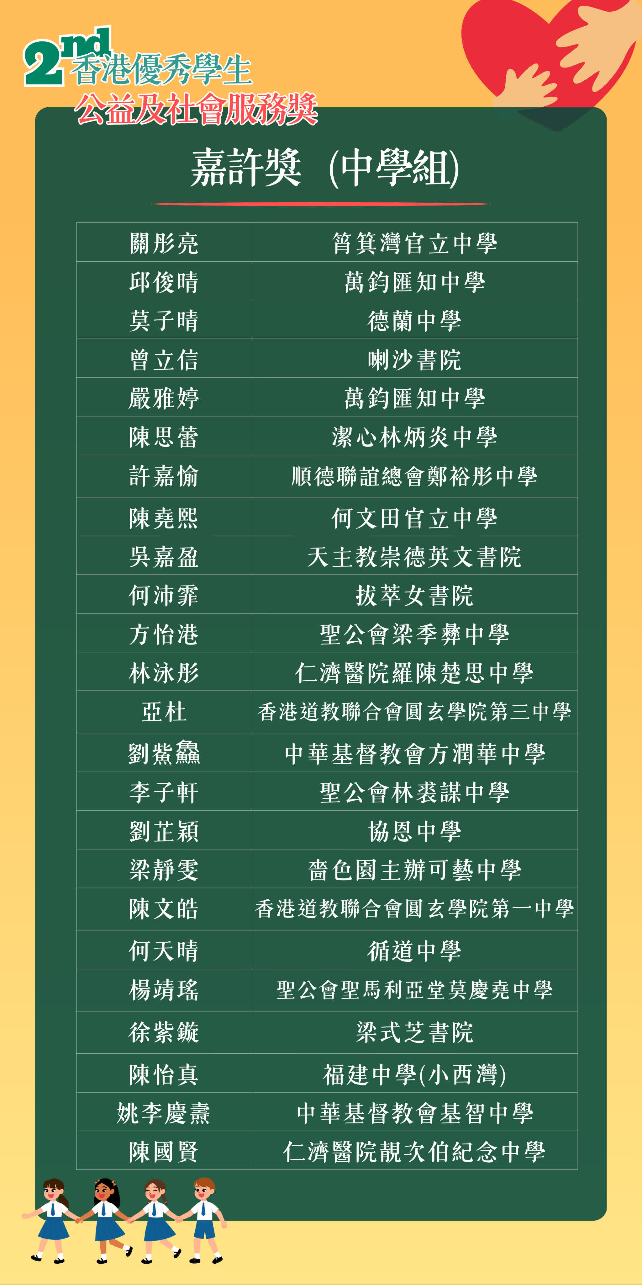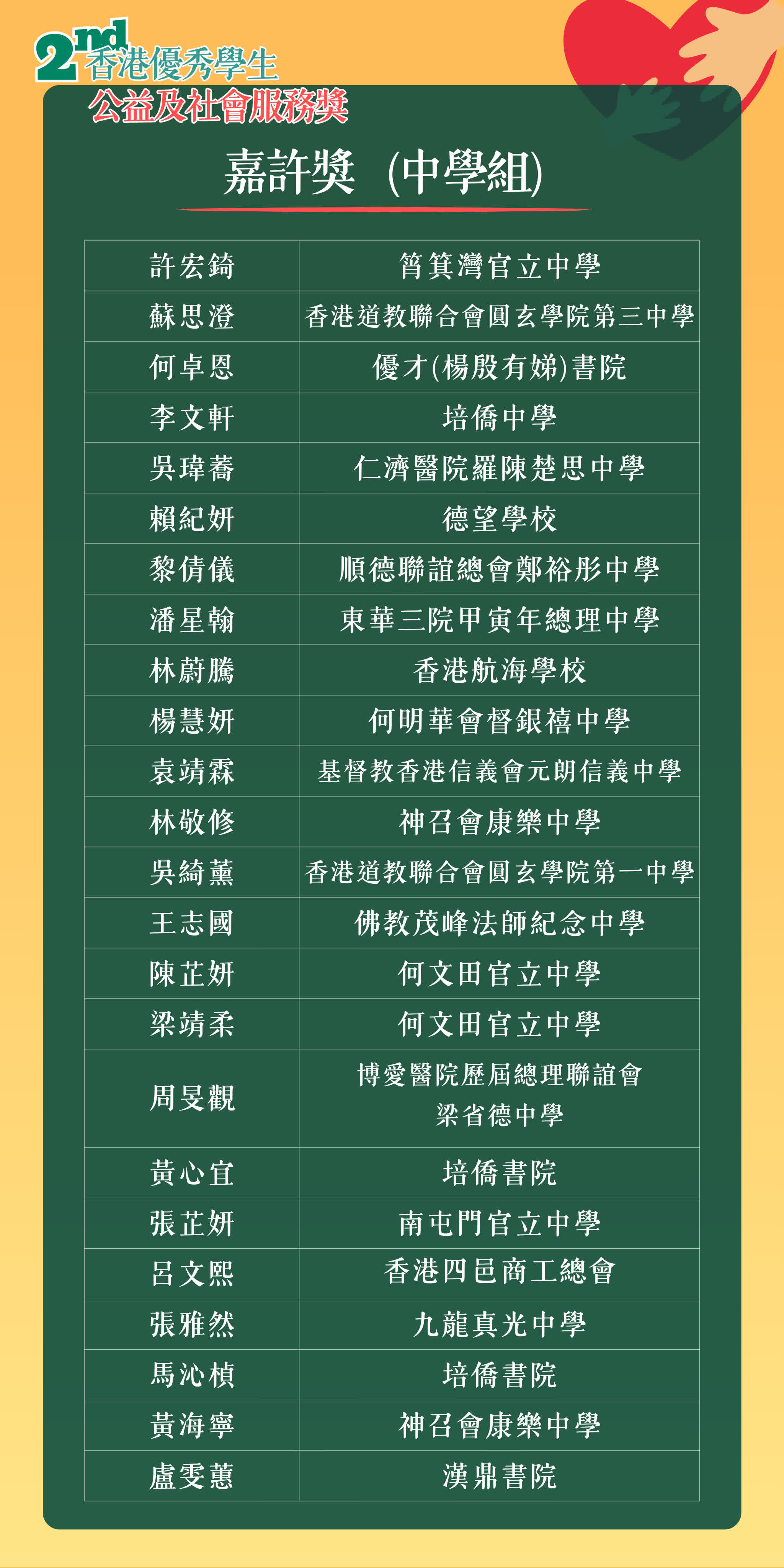 第二屆「香港優秀學生公益及社會服務獎」得獎名單如下:
