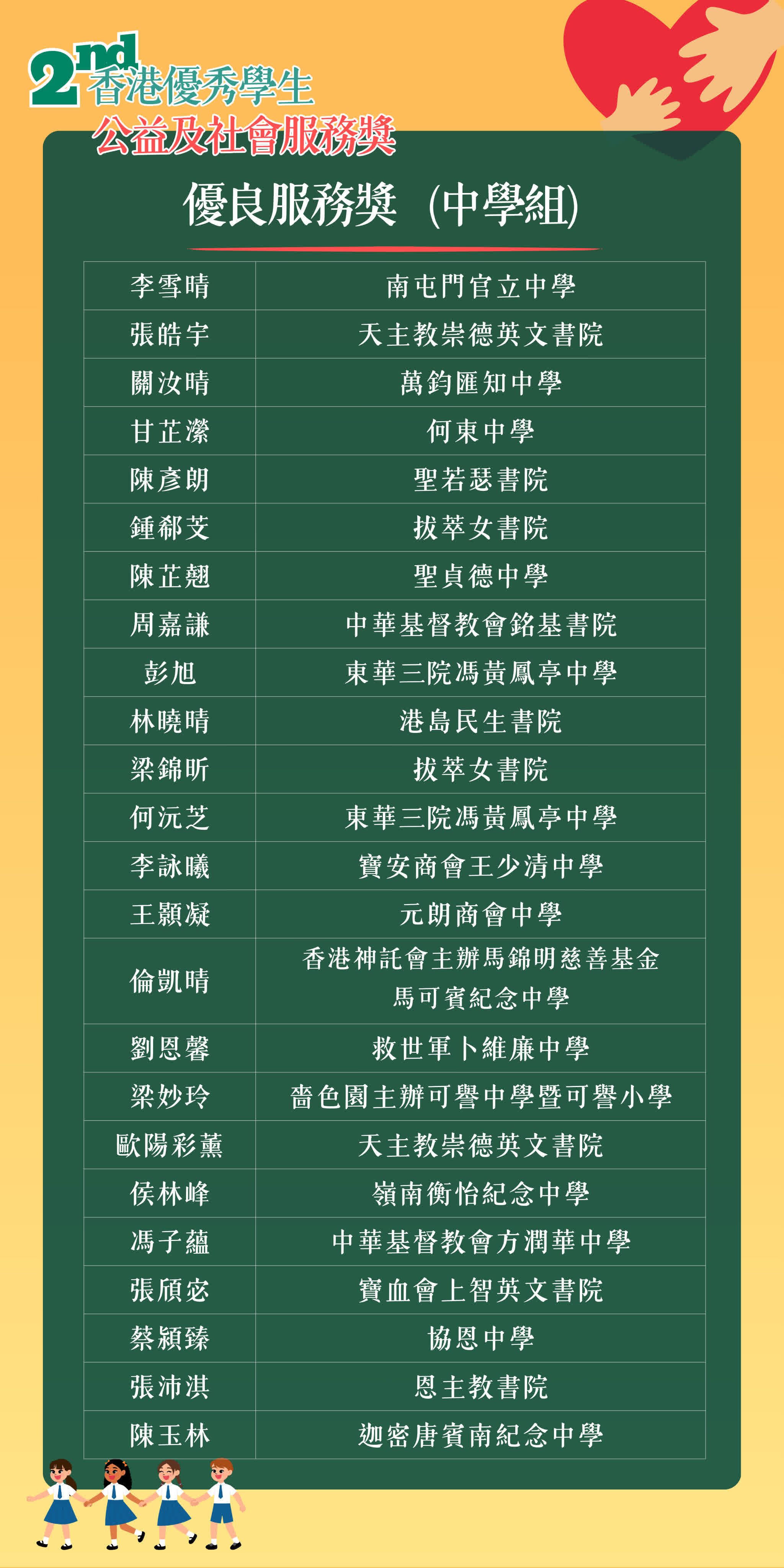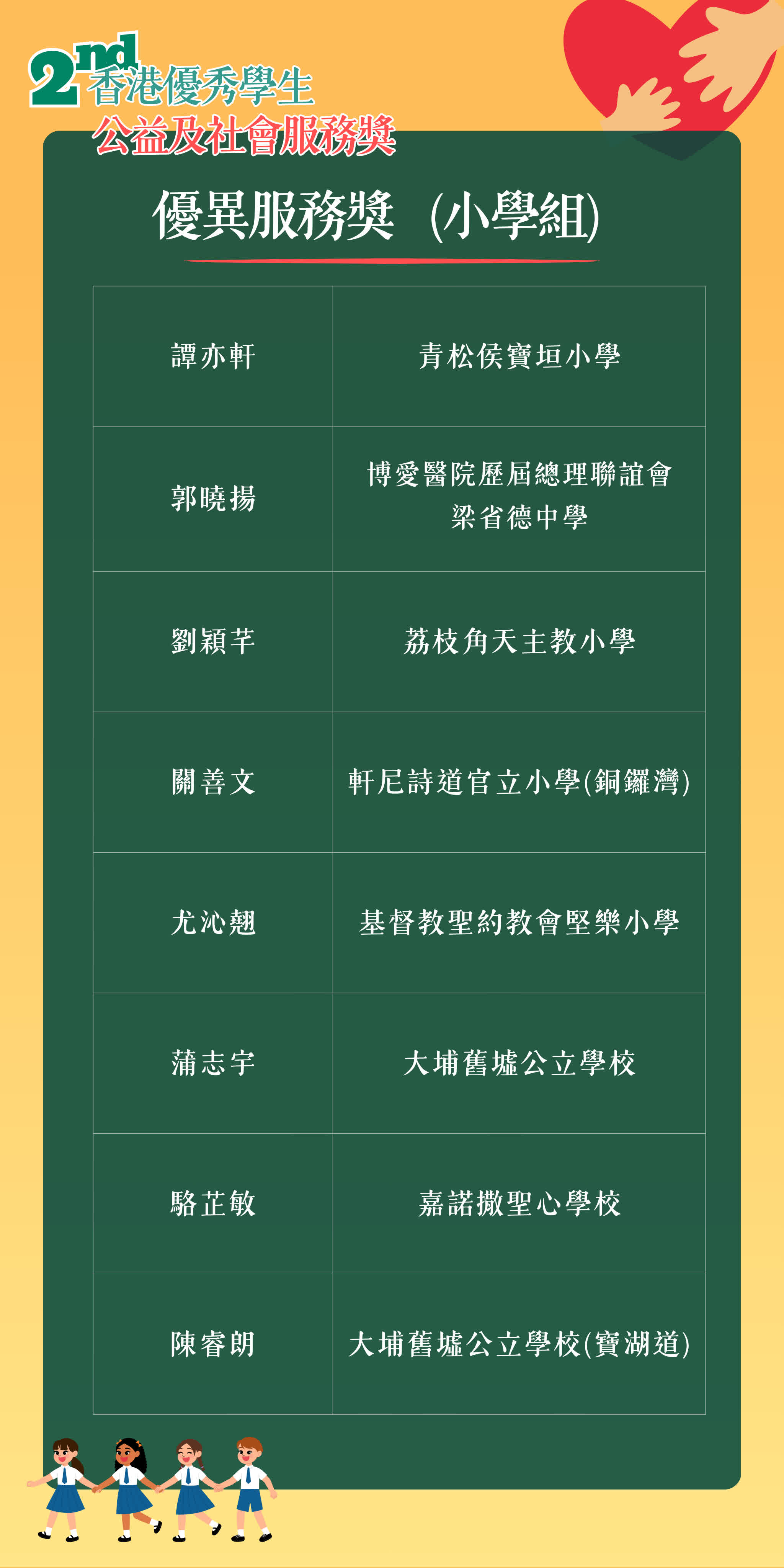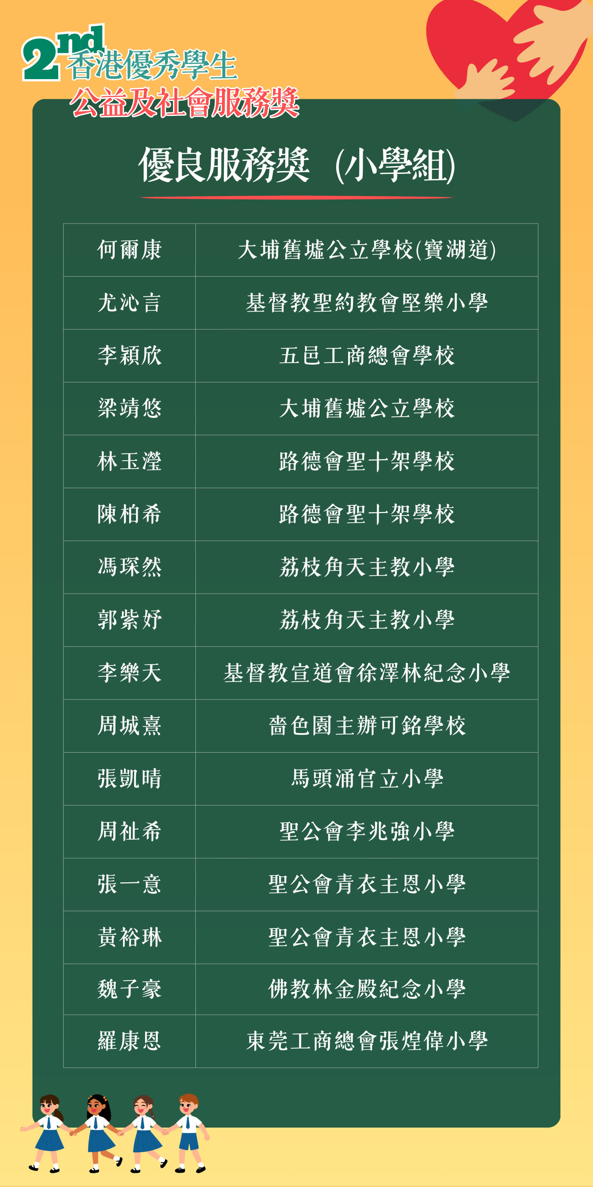 第二屆「香港優秀學生公益及社會服務獎」得獎名單如下: