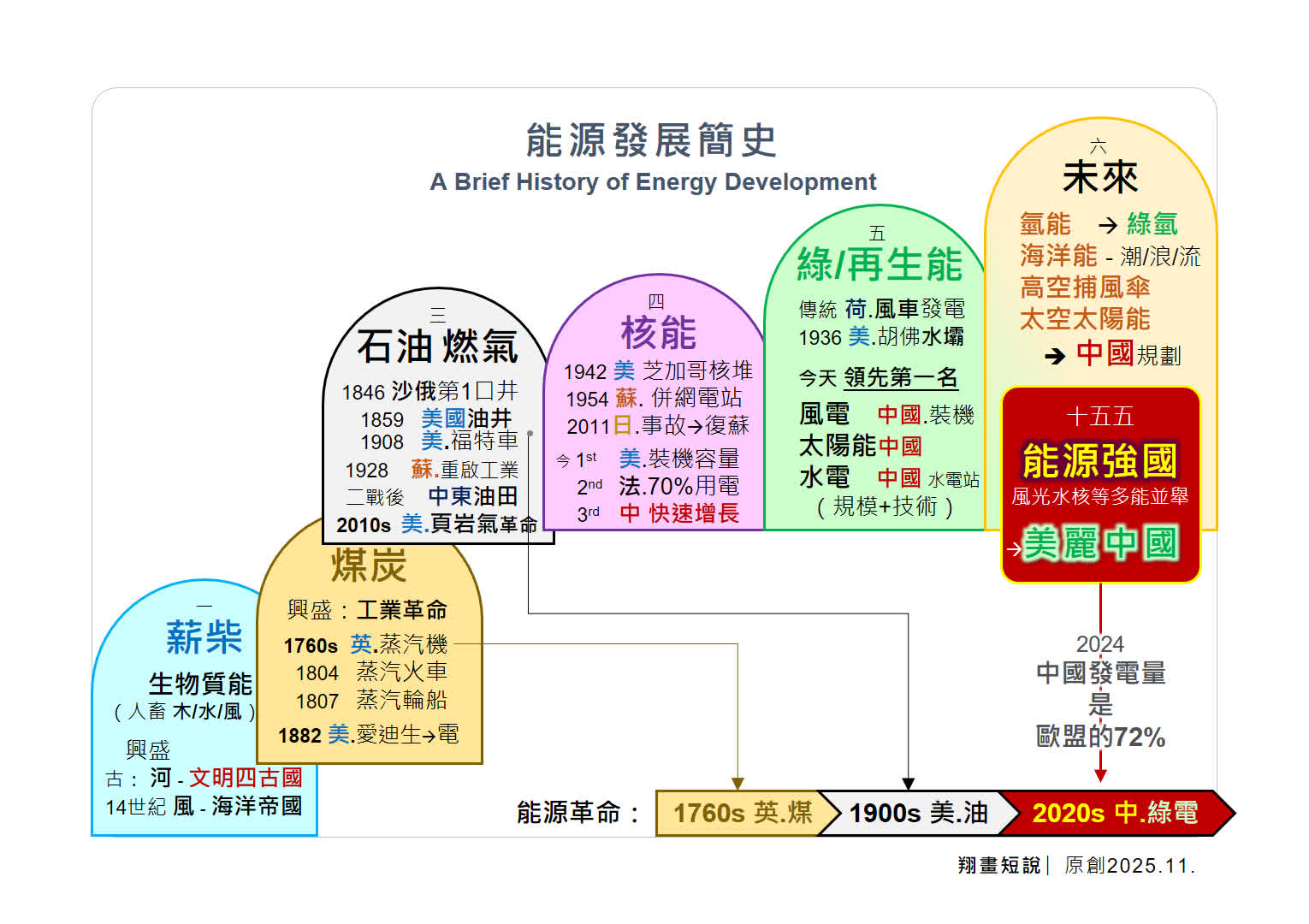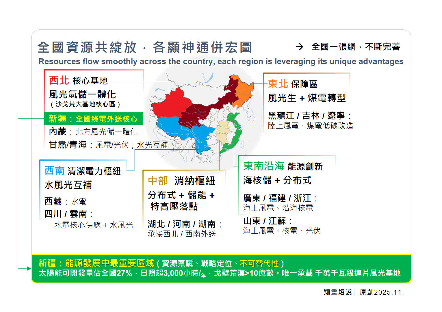 中國以五年規劃為引領,構建完整的戰爭物資保障體系:糧食自給率穩定在90%以上,國防現代化持續推進,基建與運輸網絡高效完備。面對能源結構中「富煤、缺油、少氣」的現實,中國積極推進多元布局:西北發展風光氫儲一體化,西南建設大型水電站......清潔電力正成為中國能源安全的新支柱,更被喻為第三次能源革命的「綠電」代表國家。(見圖三幅)
