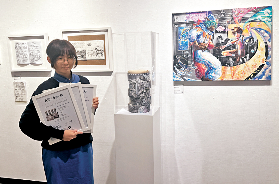 值得一提的是,入選的中六視覺藝術學生戚詠榆獲得了三位漫畫家評審的特別推薦。其名為《迷失於平凡的循環》的作品運用鋼筆和墨水在紙上繪製細膩線條,刻畫出少年行為背後豐富而複雜的內心世界。更為特別的是,作品由五塊圓柱體組成,觀眾可從360度多角度欣賞。據她介紹,作品描繪了三種「表裏不一」的行為:參加自己並不真正感興趣的熱門演唱會,為了融入群體而觀看大眾口味的電影,以及建立表面友誼而非真誠交往。「這些行為反映出他為迎合他人而掙扎的狀態,和對『平凡』身份的執着追求。為了視覺化展現這些生活碎片,我將圓柱體以微微傾斜、不規則疊高的方式排列,象徵他因忽視自我聲音而逐步走向心理失衡的過程。」她解釋,圓柱體本身也寓意着生活的「無限循環」,其弧面亦反映出壓抑自我的不斷回轉與內心掙扎。