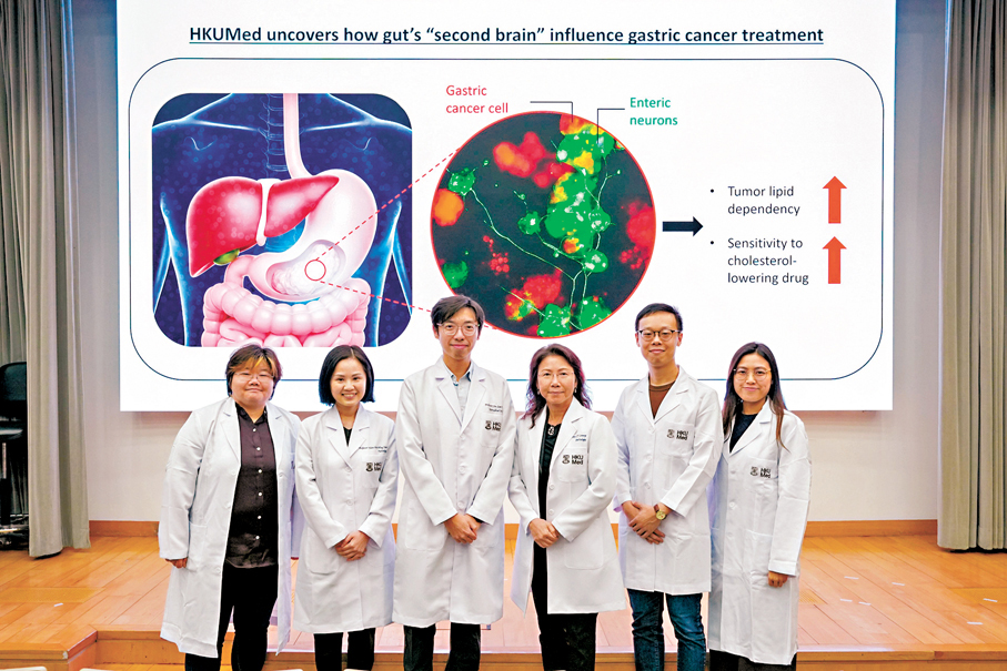 香港文匯報訊 (記者 姜嘉軒)香港大學醫學院的研究團隊在胃癌研究上取得突破,揭示人體「第二大腦」,即消化系統中的腸神經元,會影響腫瘤生長及治療反應。研究顯示,腸神經元會促使胃癌細胞更依賴脂質(即脂肪酸和膽固醇)來維持生存,若癌細胞有神經元滲入,使用膽固醇抑制劑治療,可提升殺死癌細胞的效果6.3倍。這項發現為開發個人化胃癌療法開闢新方向,相關研究成果已在《細胞—幹細胞》期刊發表。