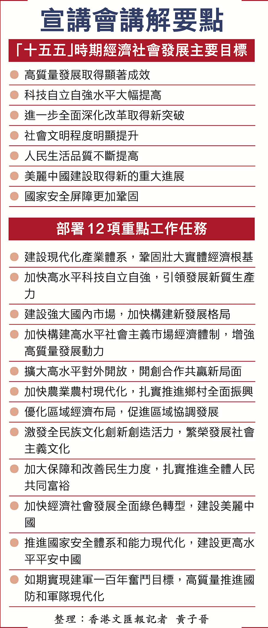第二,準確把握「十五五」時期中國經濟社會發展的形勢任務。「十四五」時期,粵港澳大灣區成為中國開放程度最高、經濟活力最強的區域之一,中央全力支持香港保持獨特地位和優勢,鞏固國際金融、航運、貿易中心地位,維護自由開放規範的營商環境,拓展暢通便捷的國際聯繫,有力促進香港由亂到治走向由治及興,實現經濟蓬勃發展,社會事業全面進步,社會大局總體穩定。