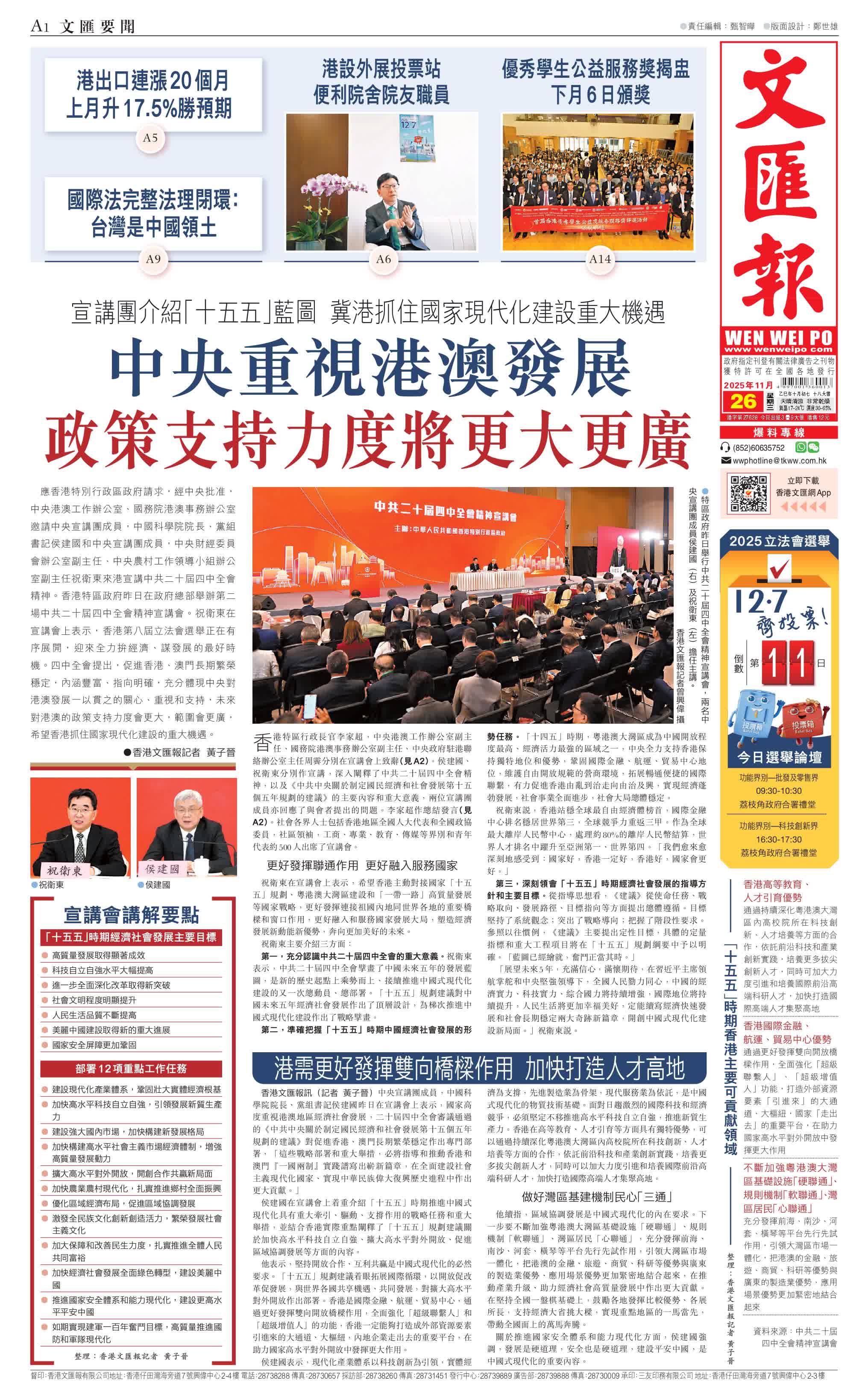 香港文匯報訊(記者 黃子晉)應香港特別行政區政府請求,經中央批准,中央港澳工作辦公室、國務院港澳事務辦公室邀請中央宣講團成員,中國科學院院長、黨組書記侯建國和中央宣講團成員,中央財經委員會辦公室副主任、中央農村工作領導小組辦公室副主任祝衛東來港宣講中共二十屆四中全會精神。香港特區政府昨日在政府總部舉辦第二場中共二十屆四中全會精神宣講會。祝衛東在宣講會上表示,香港第八屆立法會選舉正在有序展開,迎來全力拚經濟、謀發展的最好時機。四中全會提出,促進香港、澳門長期繁榮穩定,內涵豐富、指向明確,充分體現中央對港澳發展一以貫之的關心、重視和支持,未來對港澳的政策支持力度會更大,範圍會更廣,希望香港抓住國家現代化建設的重大機遇。