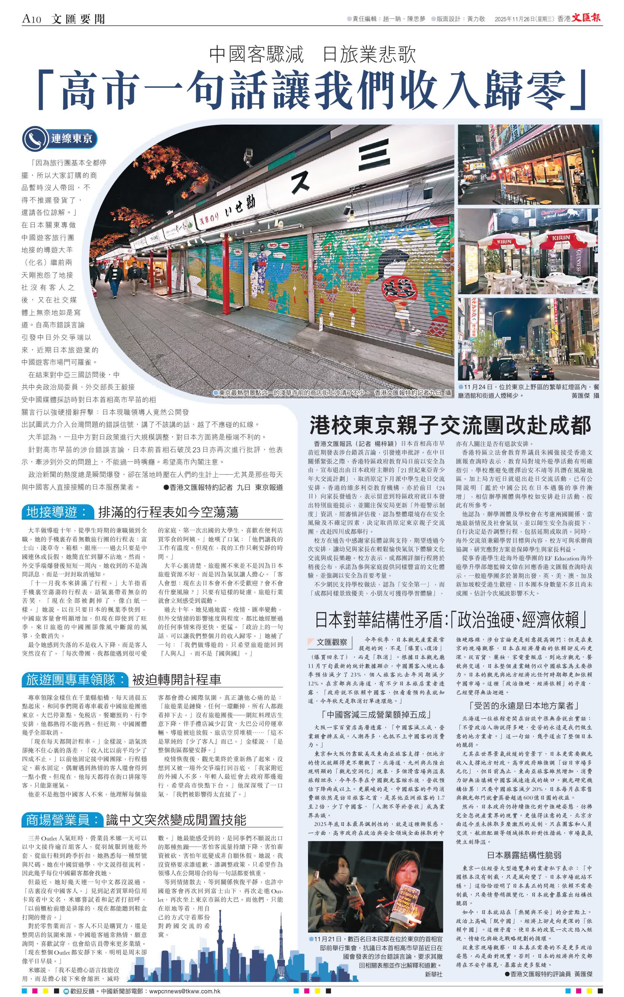 (香港文匯報特約評論員 黃匯傑)今年秋季,日本觀光產業最常提起的詞,不是「爆買い復活」(爆買回來了),而是「取消」。根據日本觀光廳11月下旬最新的統計數據顯示,中國團客入境比春季預估減少了23%,個人旅客比去年同期減少12%。在京都與北海道,有不少日本旅店業者透露,「政府說不依賴中國客,但看看預約表就知道,今年秋天是取消訂單連環炮。」