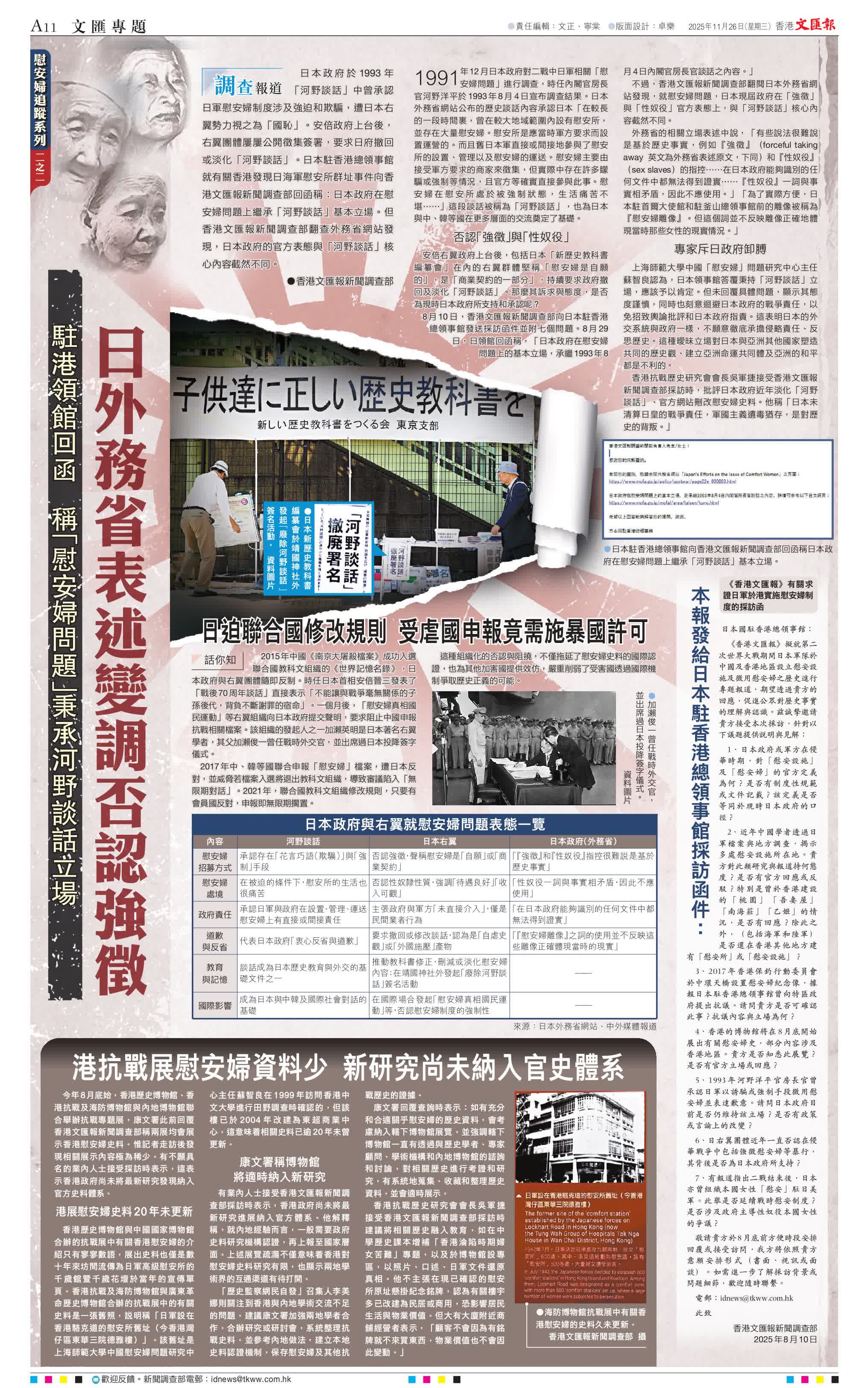 8月10日,香港文匯報新聞調查部向日本駐香港總領事館發送採訪函件並附七個問題。8月29日,日領館回函稱,「日本政府在慰安婦問題上的基本立場,承繼1993年8月4日內閣官房長官談話之內容。」