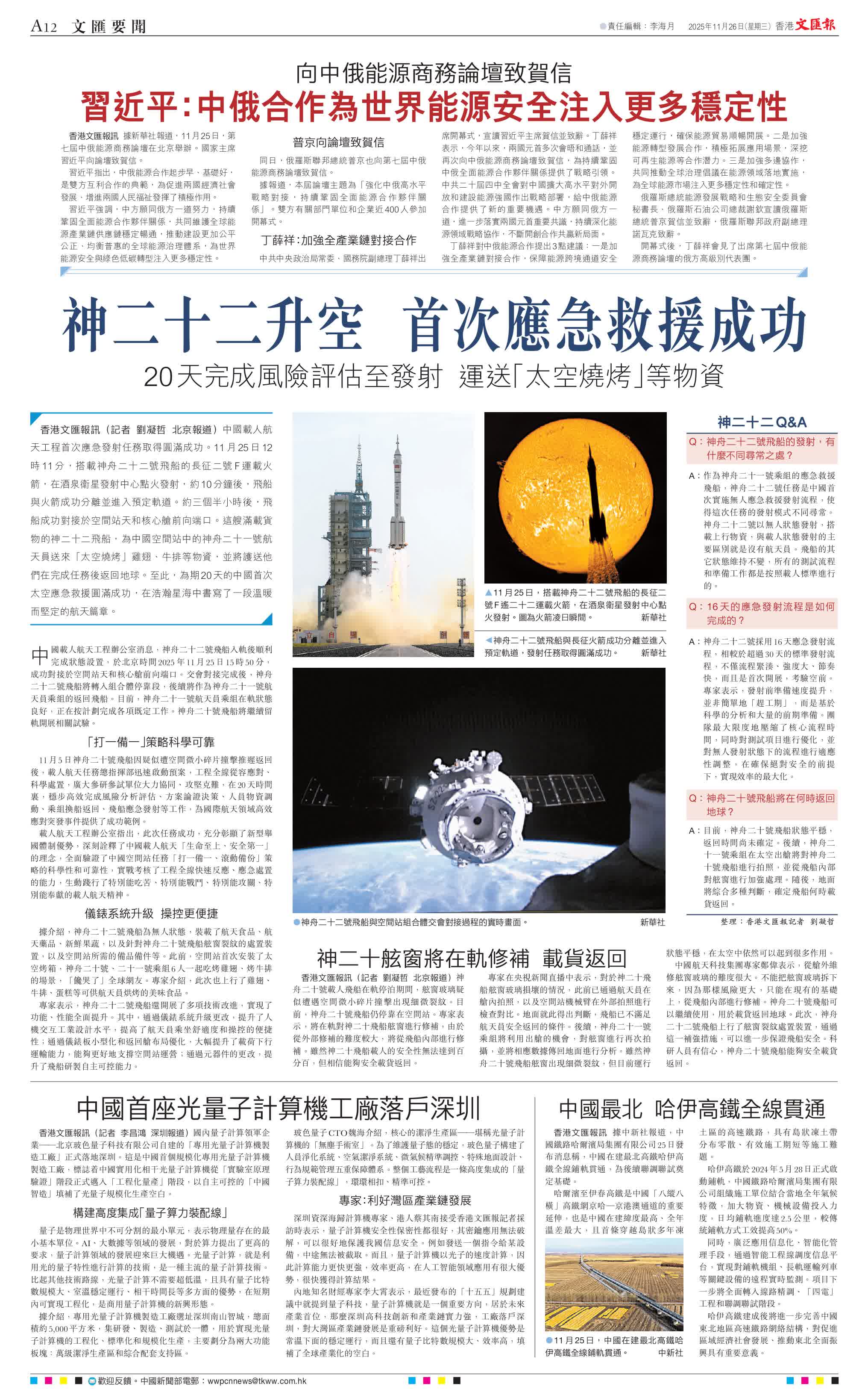 香港文匯報訊(記者 劉凝哲 北京報道)中國載人航天工程首次應急發射任務取得圓滿成功。11月25日12時11分,搭載神舟二十二號飛船的長征二號F運載火箭,在酒泉衛星發射中心點火發射,約10分鐘後,飛船與火箭成功分離並進入預定軌道。約三個半小時後,飛船成功對接於空間站天和核心艙前向端口。這艘滿載貨物的神二十二飛船,為中國空間站中的神舟二十一號航天員送來「太空燒烤」雞翅、牛排等物資,並將護送他們在完成任務後返回地球。至此,為期20天的中國首次太空應急救援圓滿成功,在浩瀚星海中書寫了一段溫暖而堅定的航天篇章。