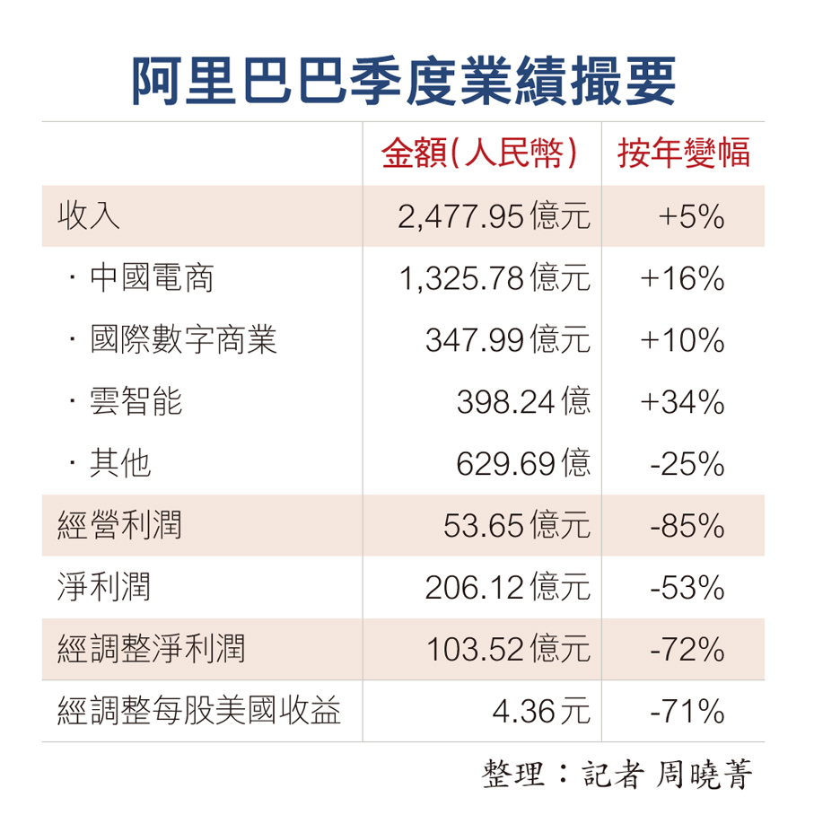 香港文匯報訊(記者 周曉菁)「外賣大戰」影響持續,阿里巴巴(9988)昨放榜,截至9月底止第二財季業績收入按年升5%至2,477.95億元(人民幣,下同),非公認會計準則淨利潤下降72%至103.52億元。經調整EBITA同比下降78%至90.73億元,季內中國電商集團、雲業務的持續增長所帶來的經營業績改善,部分被即時零售、用戶體驗及科技的投入所抵消,惟阿里整體表現仍略勝市場預期。阿里公布季績前曾升逾半成,最終收報157.8港元,升2.14%;昨晚美股盤前一度升逾5%。