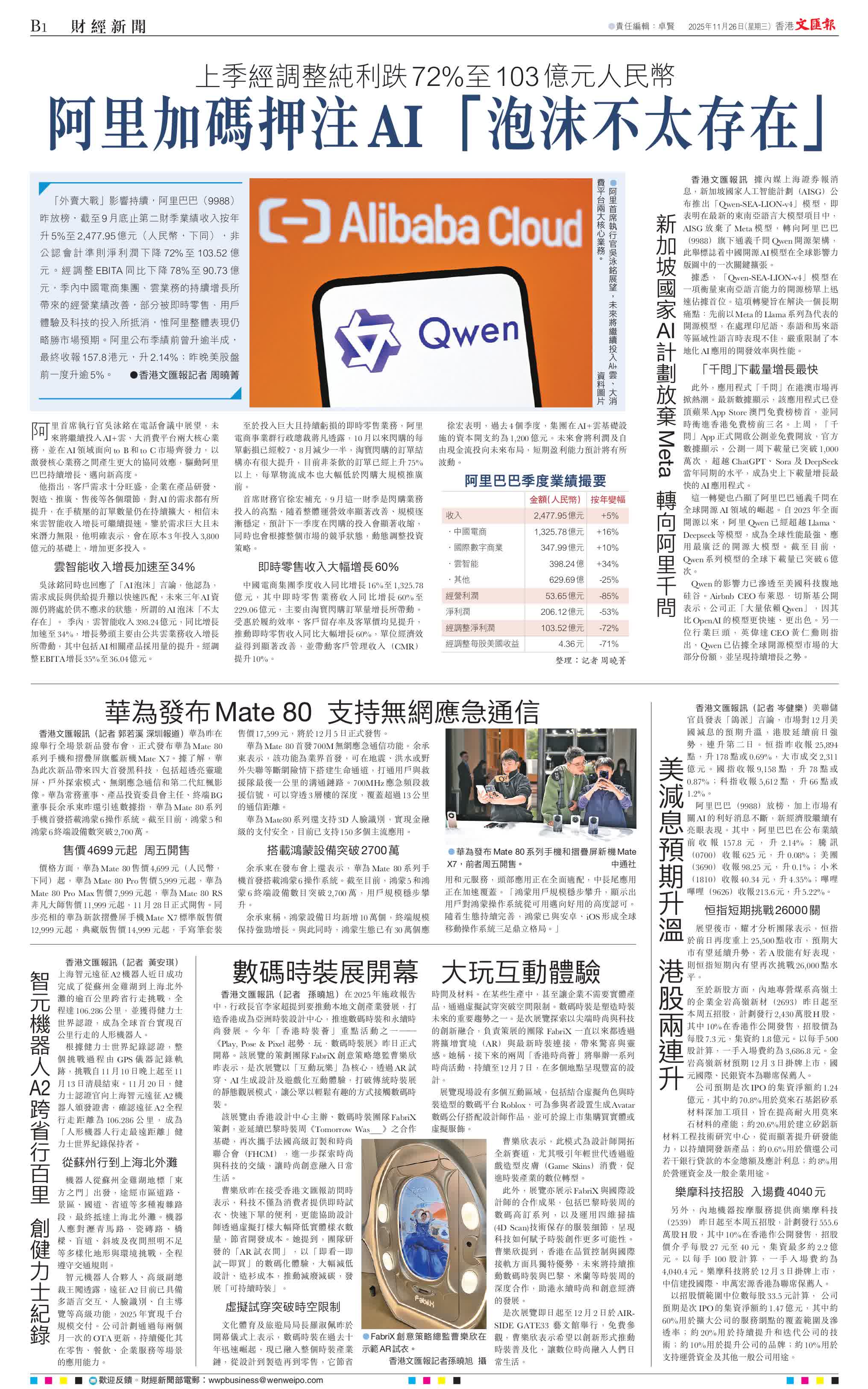 吳泳銘同時也回應了「AI泡沫」言論,他認為,需求成長與供給提升難以快速匹配,未來三年AI資源仍將處於供不應求的狀態,所謂的AI泡沫「不太存在」。 季內,雲智能收入398.24億元,同比增長加速至34%,增長勢頭主要由公共雲業務收入增長所帶動,其中包括AI相關產品採用量的提升。經調整EBITA增長35%至36.04億元。
