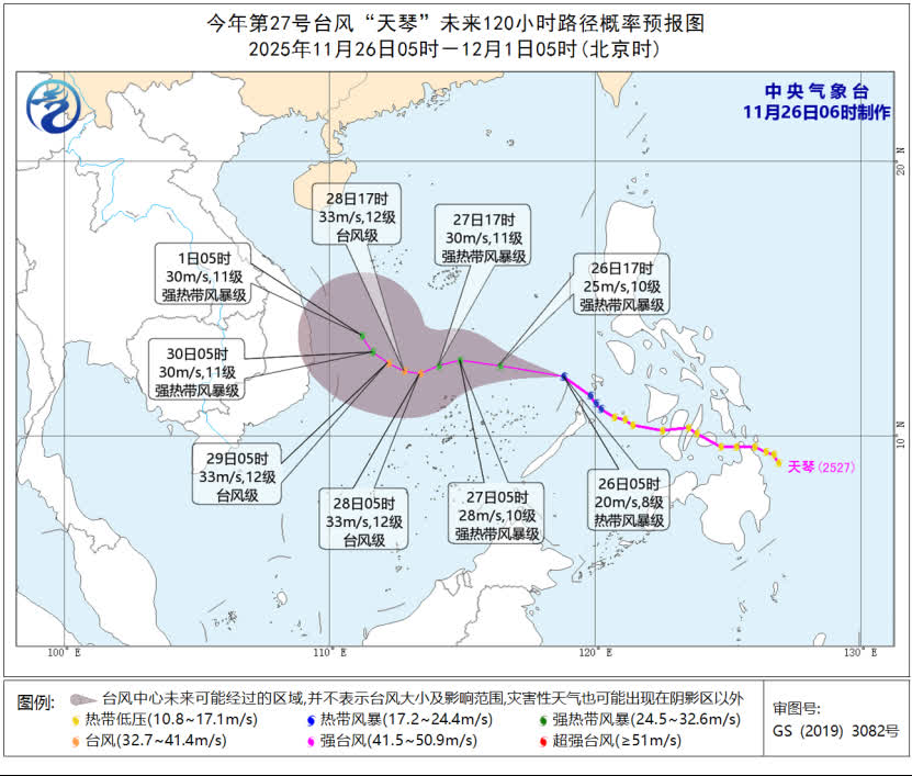 大風預報:26日08時至27日08時,受颱風和冷空氣的共同影響,台灣海峽、巴士海峽、台灣以東洋面、南海大部及東沙群島、西沙群島、中沙群島、南沙群島、黃岩島附近海域、北部灣、福建沿海、廣東東部沿海將有6-8級大風,陣風9-10級,其中南海部分海域風力可達9級,「天琴」中心經過的海域風力可達10級,陣風11-12級。