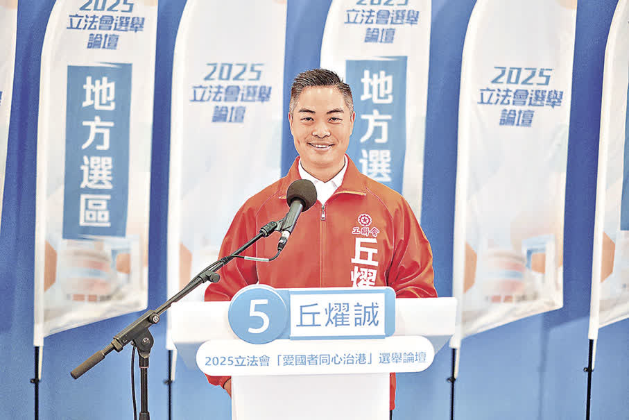 5號候選人、黃大仙區區議員丘燿誠表示,自己長期扎根基層,從事維護勞工權益工作,過去曾帶領團隊為舒適堡、大班餅店等員工成功追討欠薪,使其倍受激勵,因此決定參選。他認為,社區工作像一場沒有終點線的長跑,改善社區的願景如同遠方的目標,必須穩紮穩打地向前,帶領市民一起跑得更遠。