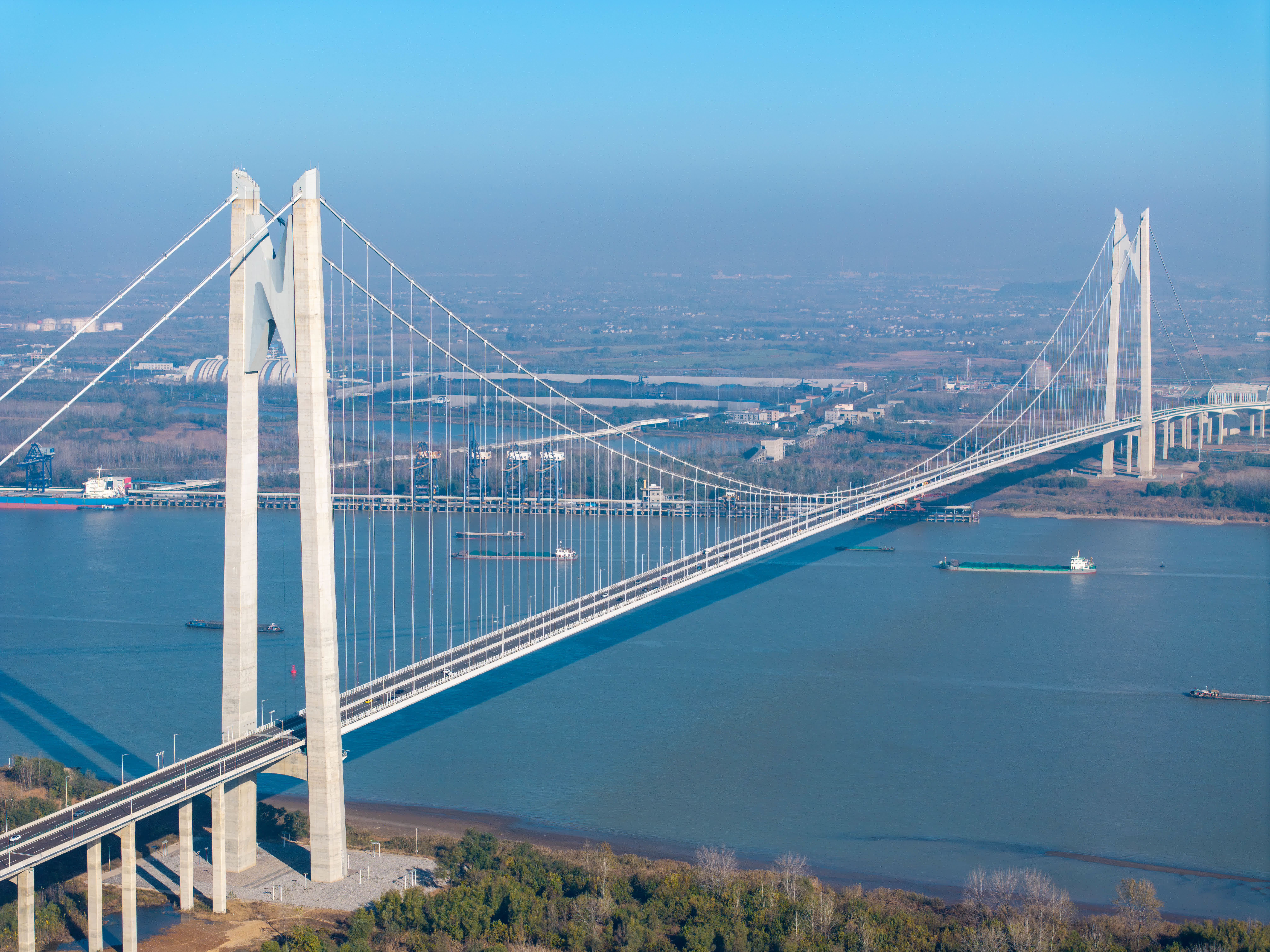 主橋鋼箱樑架設過程中,為兼顧通航與安全,箱樑由專用運輸船運輸至橋位,使用兩台500噸纜載吊機,配合最先進的全液壓連續千斤頂提升、行走系統,由跨中向主塔方向依次吊裝;創新採用「邊架設、邊焊接」工藝,大大提升吊裝效率,3個月完成97個節段架設任務,並順利實現大橋合龍。