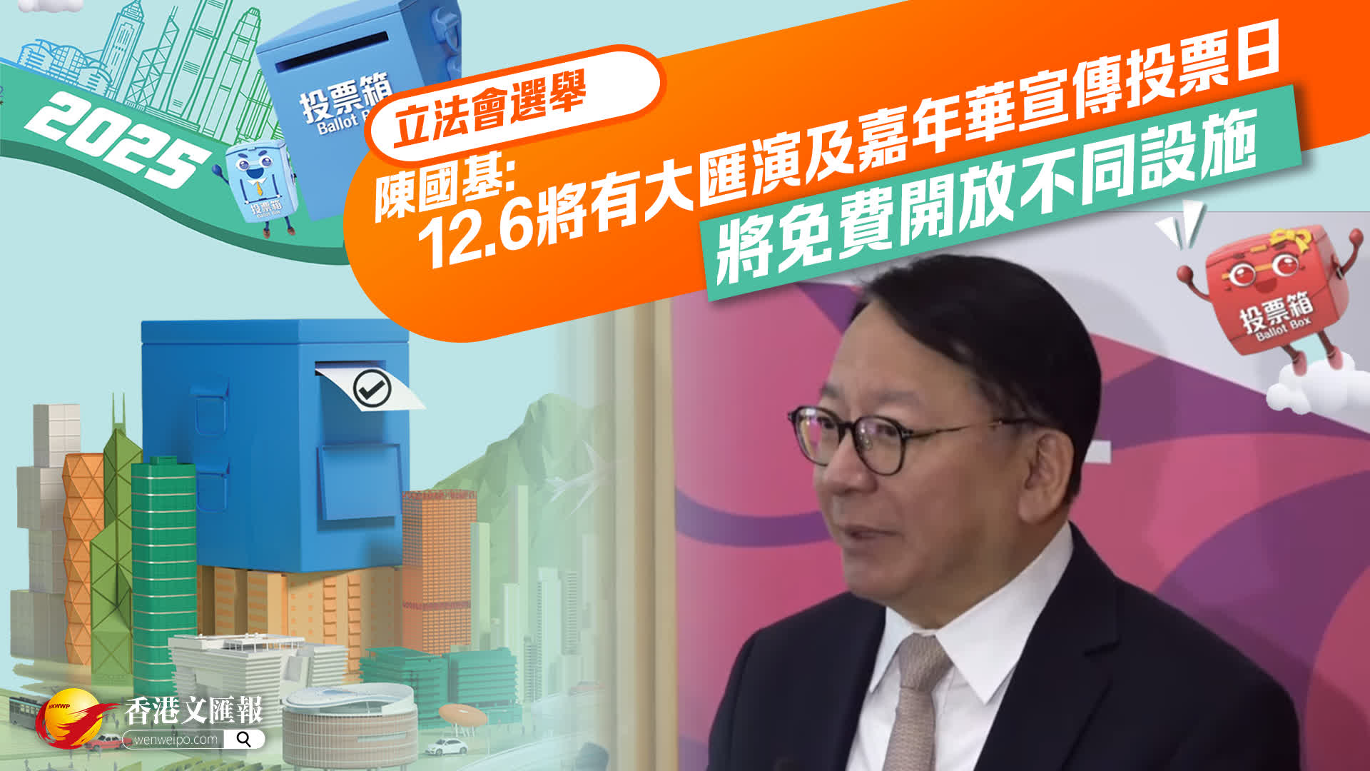 政務司司長陳國基聯同政制及內地事務局局長曾國衞,今日(26日)上午就2025年立法會換屆選舉期間向選民派發心意謝卡的安排會見傳媒。陳國基表示,12月7日是選舉日,政府部門早前進行了各式各樣的宣傳,呼籲合資格的選民投票。選民投票之後會被派發一張心意謝卡,心意謝卡用AI生成。他續說,12月6日將有大匯演及嘉年華宣傳投票日,政府將免費開放不同設施。