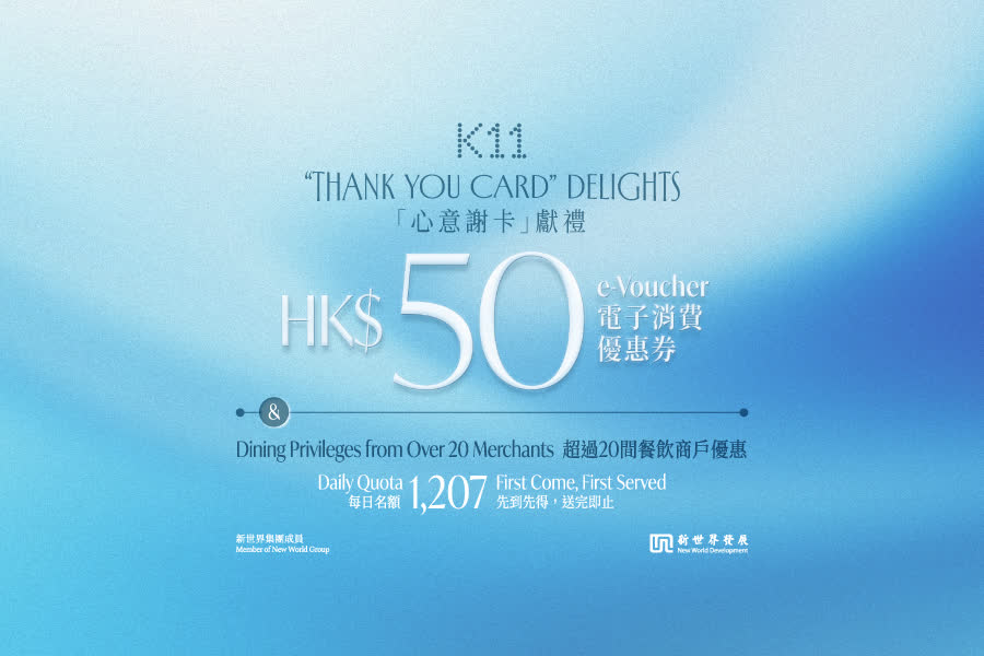 今次集團推出的消費禮遇為期一個月,由今年12月7日投票日起至明年1月8日,市民只要手持「心意謝卡」,即可在K11 MUSEA 或 K11 Art Mall 的地下禮賓部,換領價值港幣50元的電子消費優惠券,並於今年12月7日至明年1月22日,可在場內超過300間指定商戶使用,凡單一消費淨值滿港幣100元或以上即可享港幣50元折扣優惠,亦可享超過20間餐飲商戶的額外優惠。