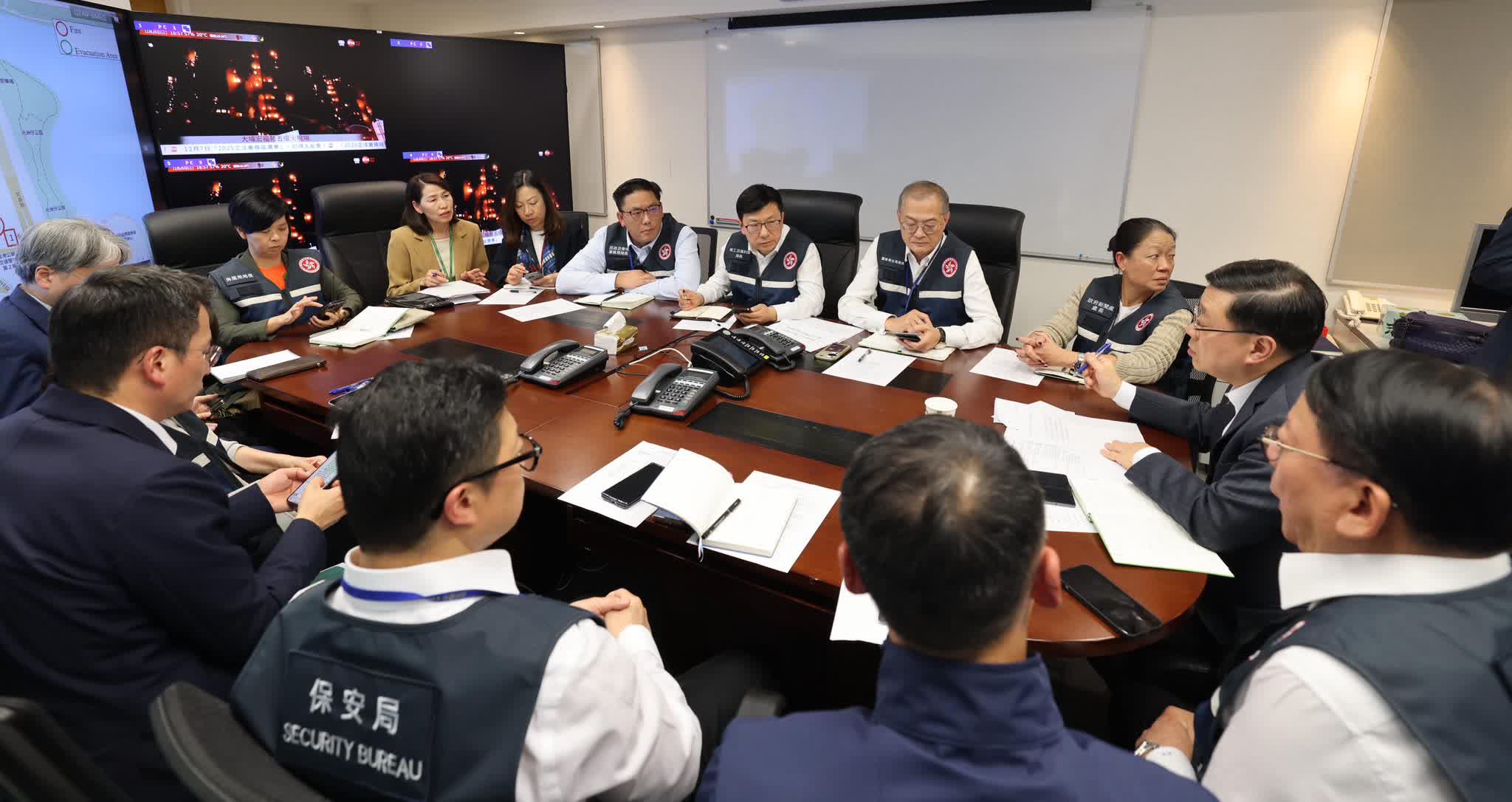 李家超在社交專頁說,已即時啟動緊急事故監察及支援中心,聽取保安局和消防處的匯報,他主持跨部門緊急會議,並指示部門全力做好滅火救援救治工作。各政府部門全力協助受火警影響的居民,將市民安全及福祉放在首位。