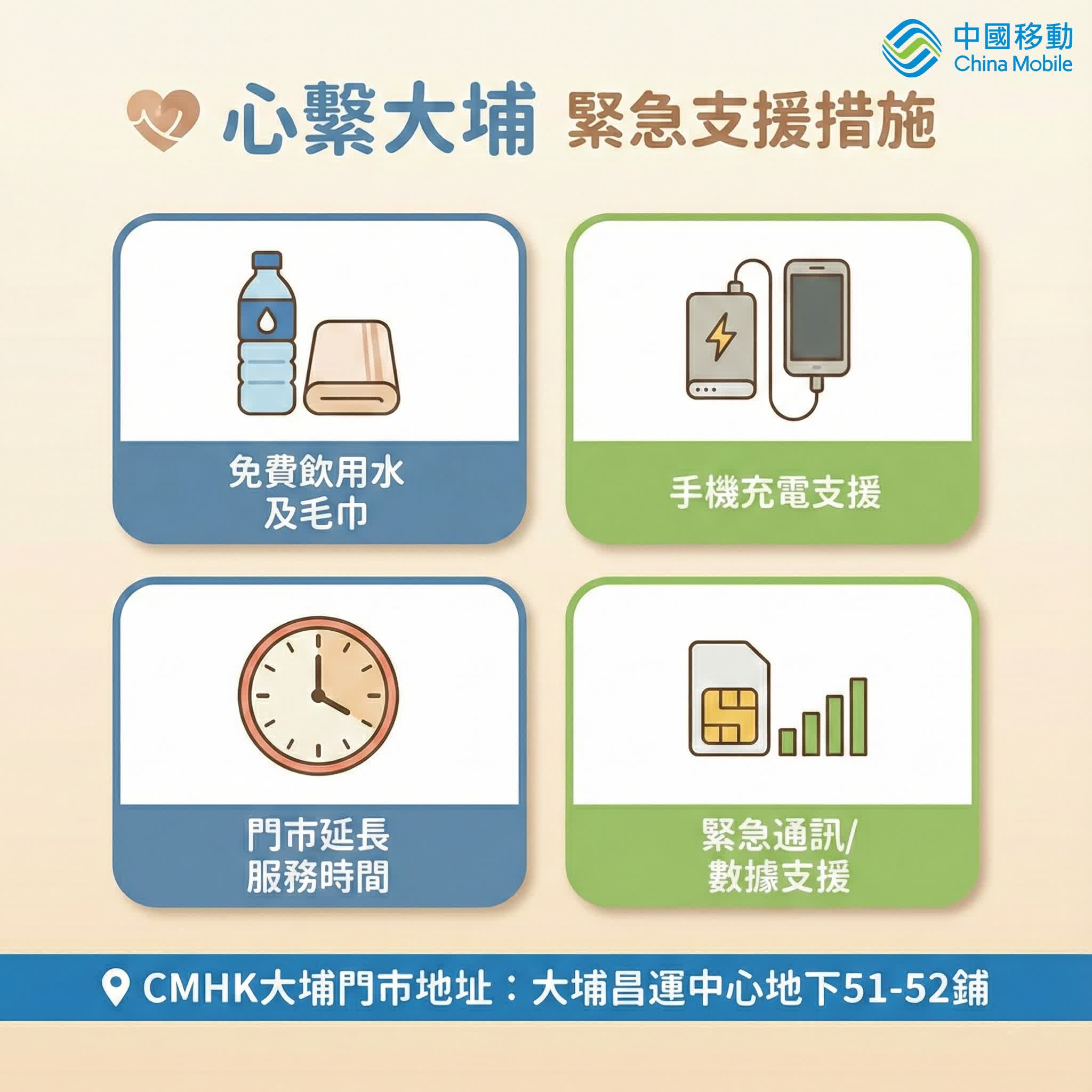 為方便受災居民,CMHK特別延長指定分店服務時間至晚上11時。考慮到災後通訊需求,公司將向受影響居民免費派發儲值卡,協助民眾與親友保持聯繫。