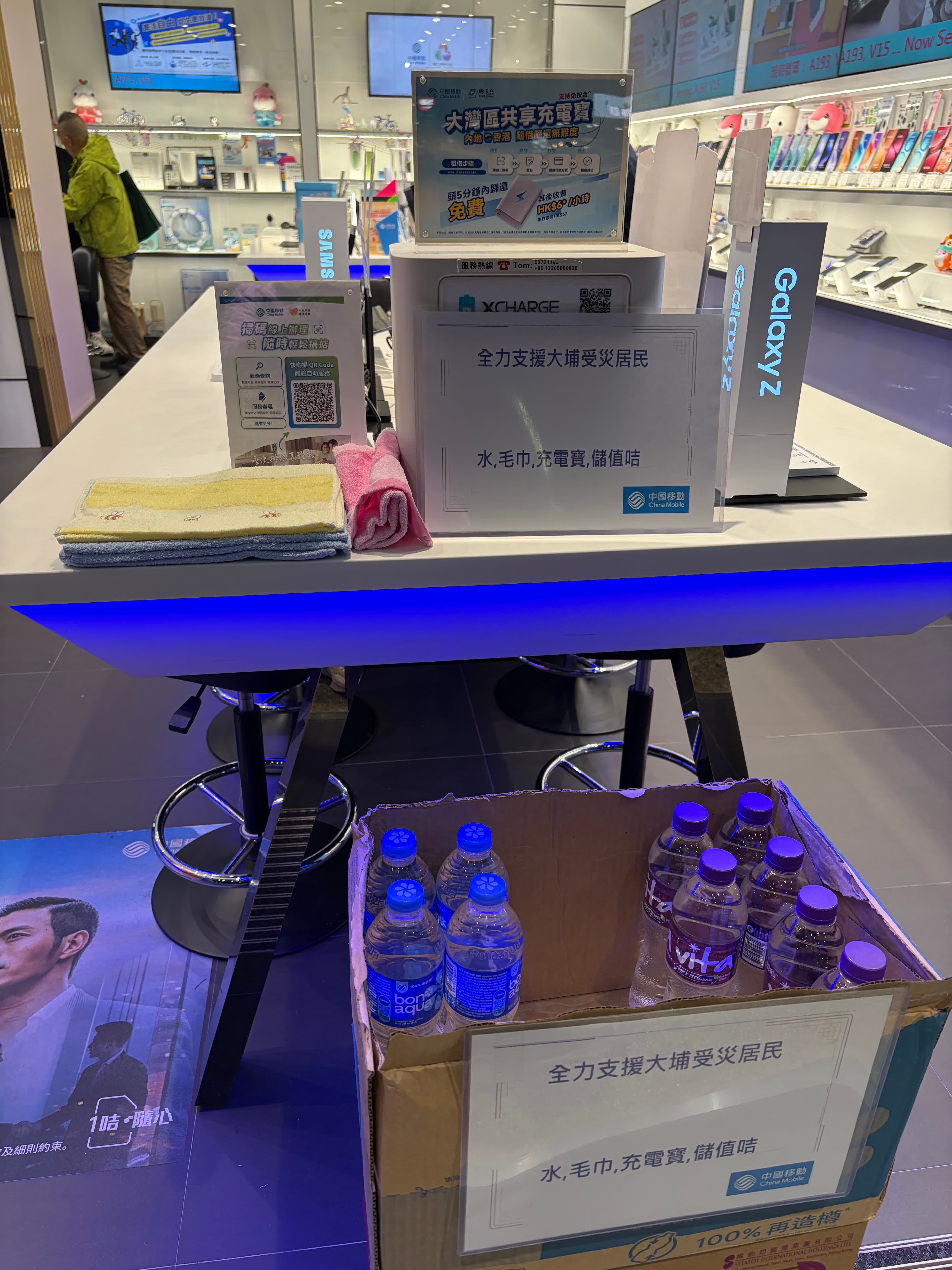 CMHK表示,公司心繫大埔社區,已在大埔昌運中心地下51-52號鋪的分店設立支援站點,提供以下緊急服務:包括準備充足的飲用水、毛巾等應急物資,同時提供充電寶借用服務,確保居民通訊設備不斷電。