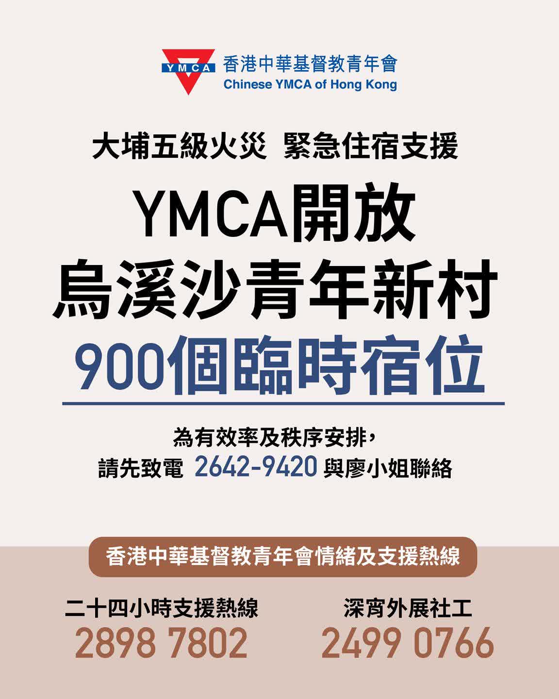 香港文匯報訊 因應大埔宏福苑火警事故,不少疏散居民正等待安置。香港中華基督教青年會開放烏溪沙青年新村(地址:馬鞍山鞍駿街2號),即晚提供900個臨時宿位予有需要的市民。