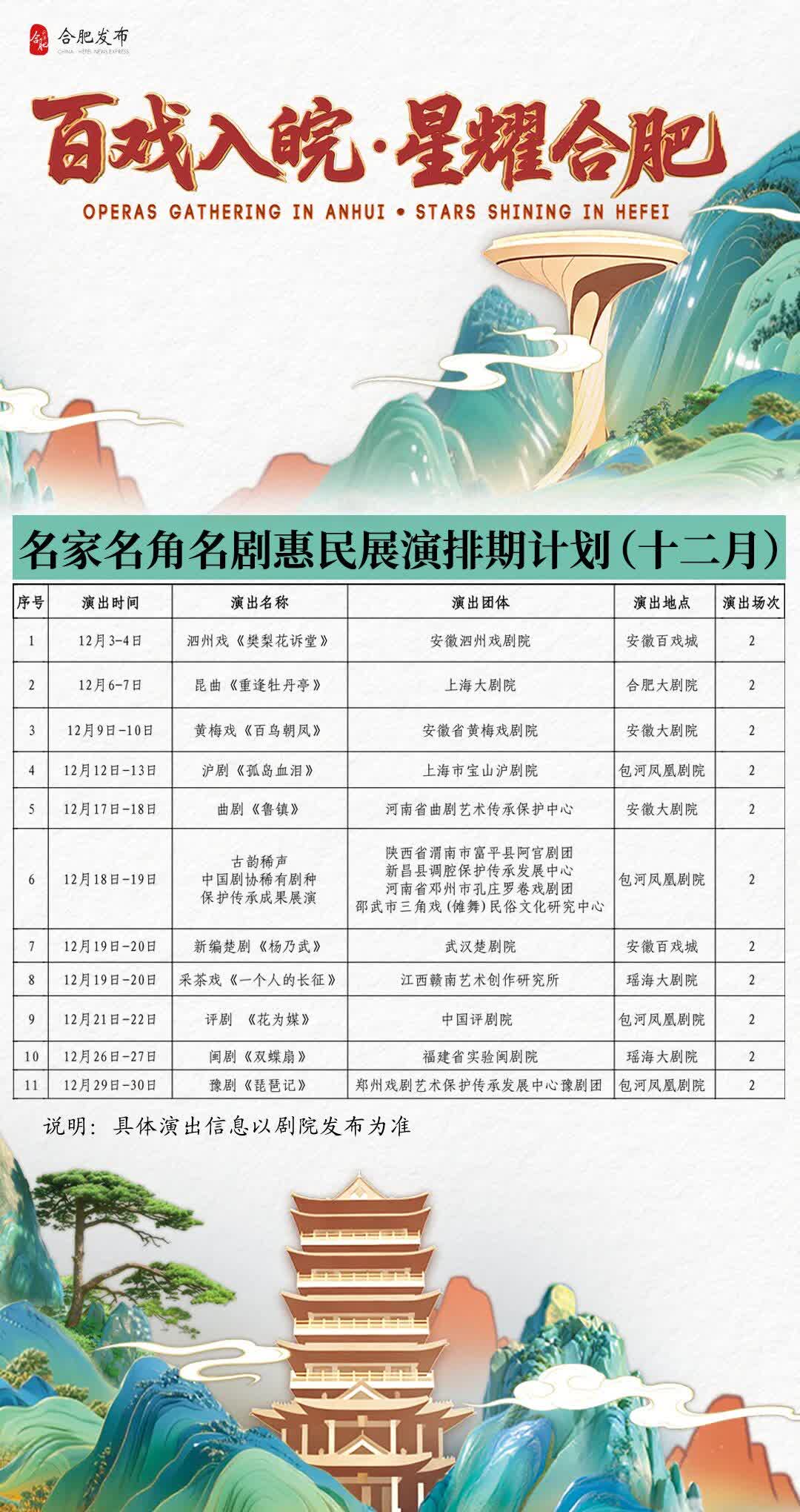 與此同時,「百戲入皖・星耀合肥」戲曲主題活動名家名角名劇惠民展演十二月排期計劃現已新鮮出爐。崑曲、豫劇、黃梅戲等多個劇種將輪番登陸合肥各大劇院,一眾中國戲劇「梅花獎」得主傾情獻藝,為市民與遊客奉上高水準的戲曲文化大餐。