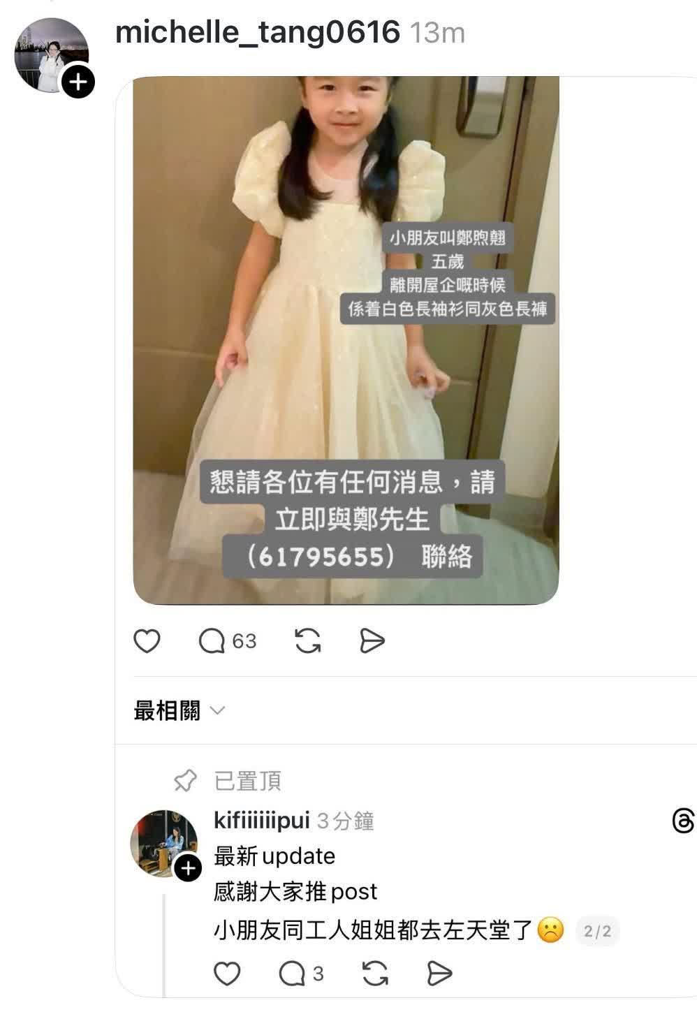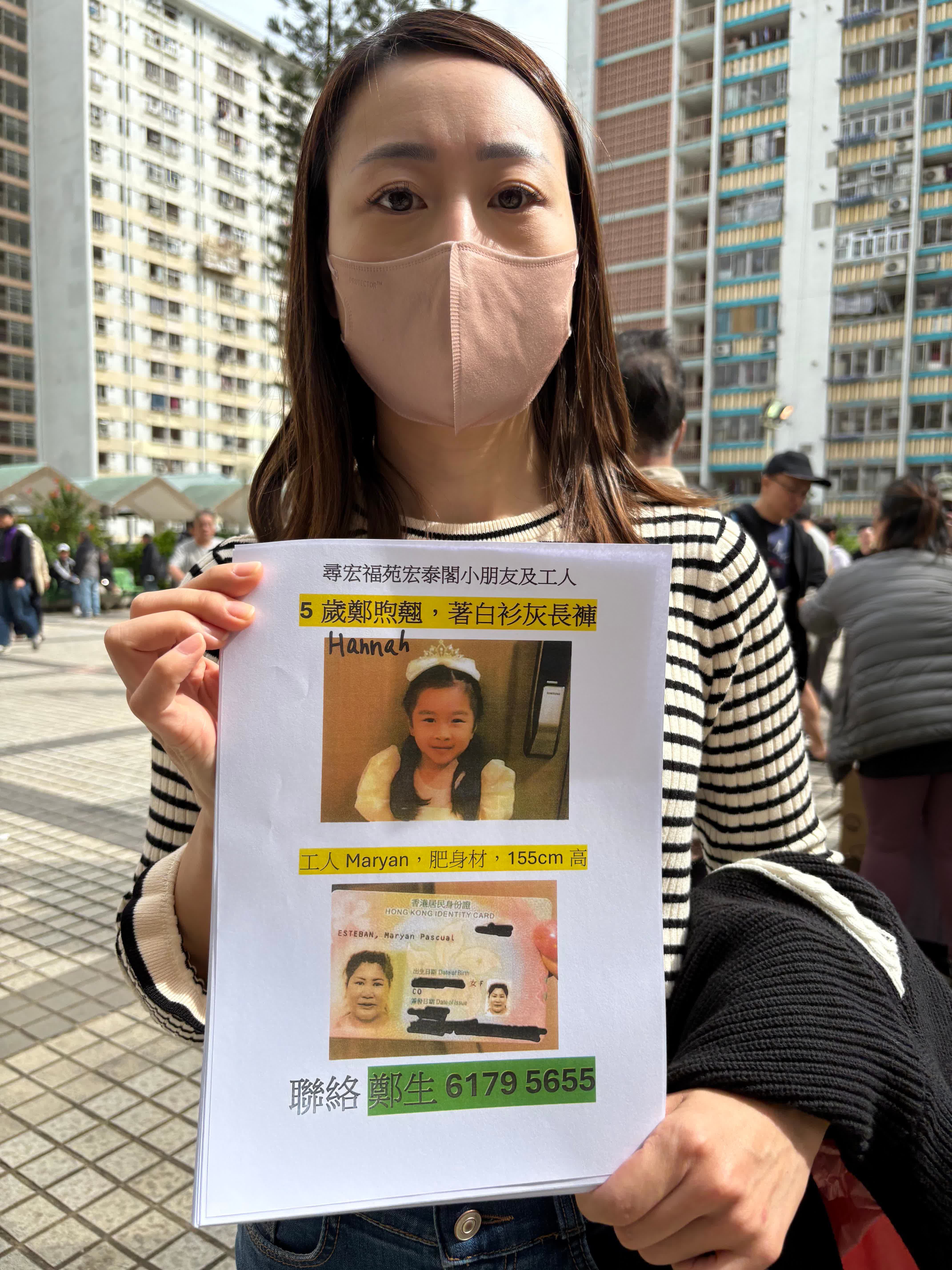 記者了解到,該名小童是居住在宏福苑宏泰閣的鄭煦翹,當時身穿白衫灰長褲,年齡5歲。家傭人名叫Maryan,肥身材,1米55高。