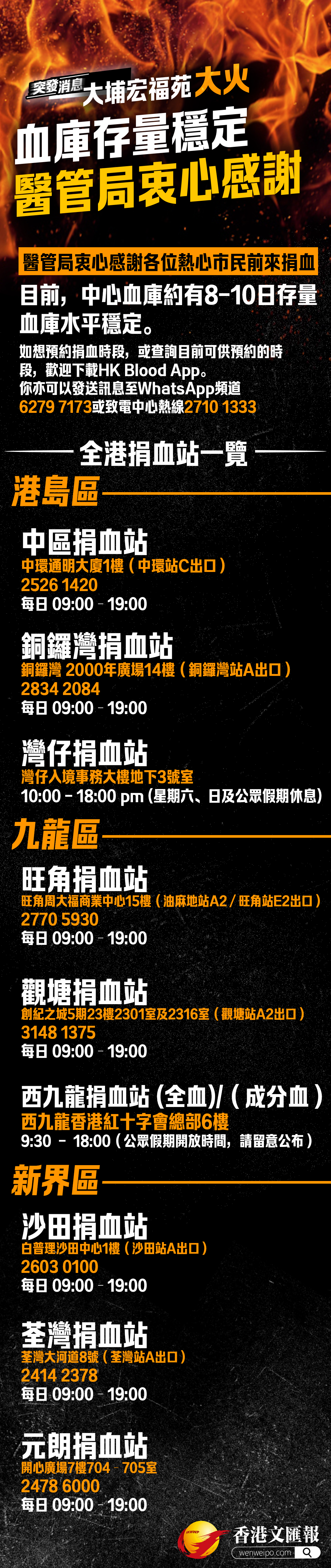 醫管局表示,衷心感謝各位熱心市民前來捐血。目前,中心血庫約有8-10日存量,血庫水平穩定。