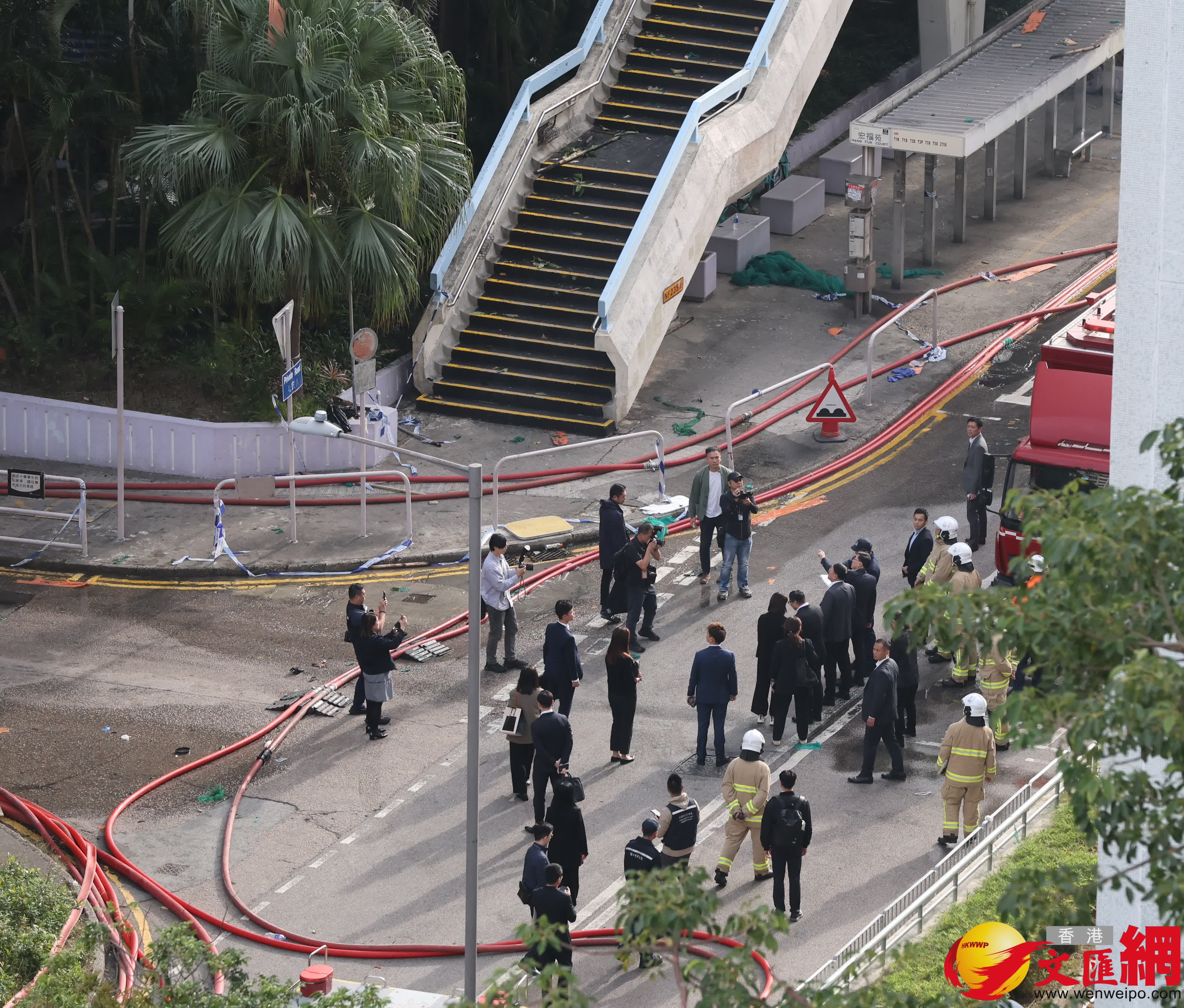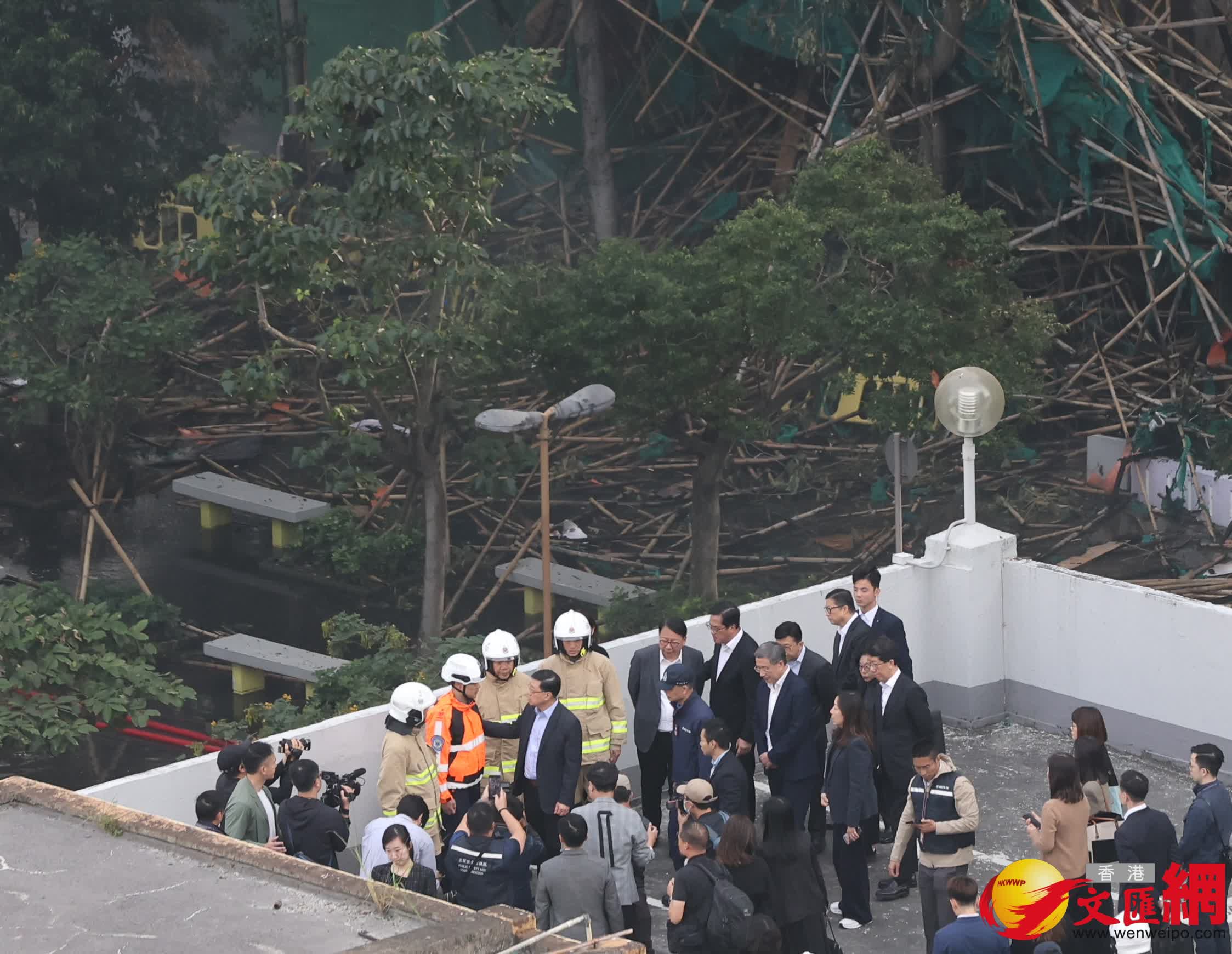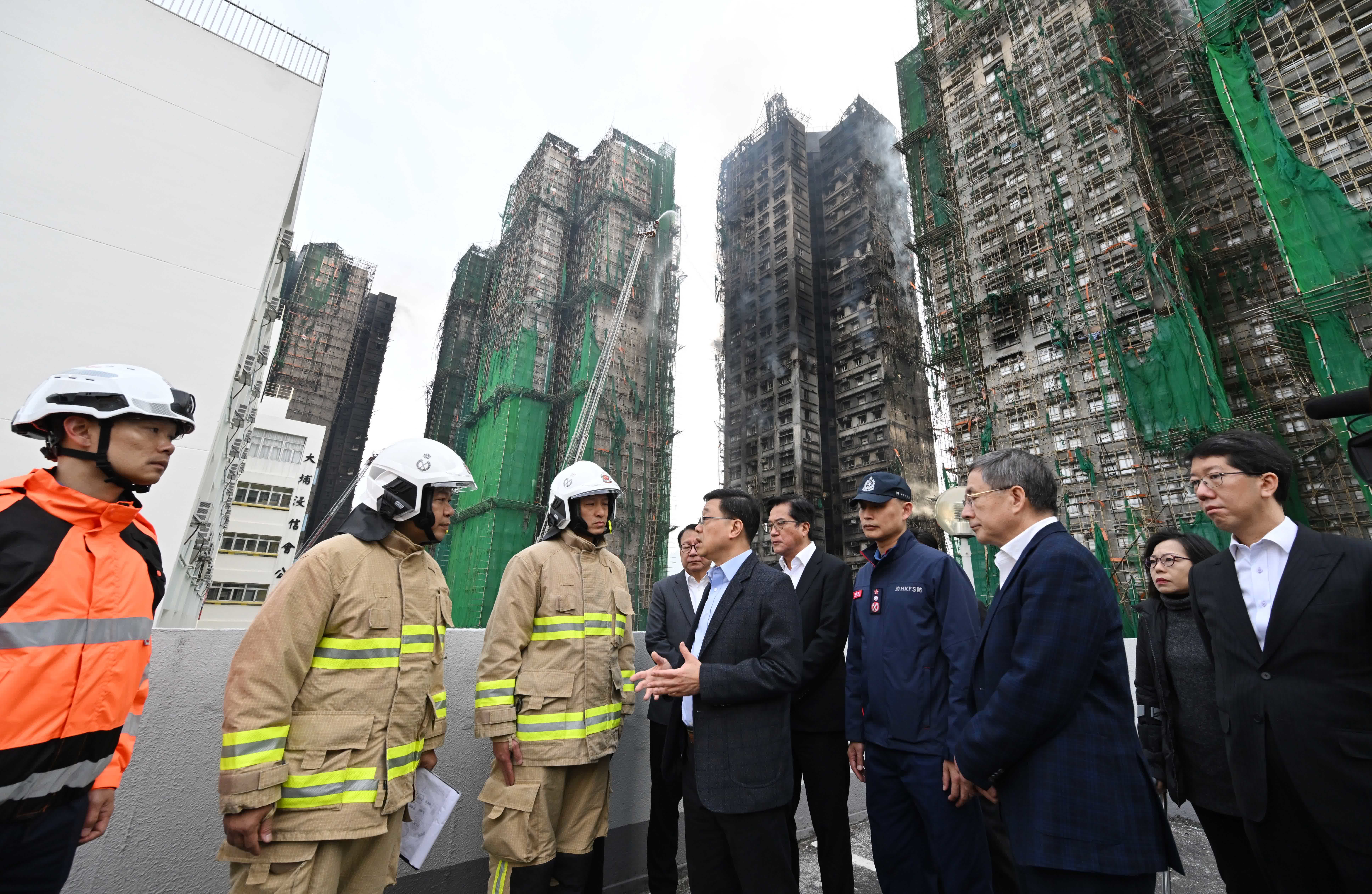 香港文匯報訊(記者 蕭景源)大埔宏福苑五級火警,至今已釀成至少55人死亡,至少72傷者送院治理。今日(27日)下午3時許,行政長官李家超在政務司司長陳國基和保安局局長鄧炳強陪同下,抵達宏富苑現場視察火警的最新進展。