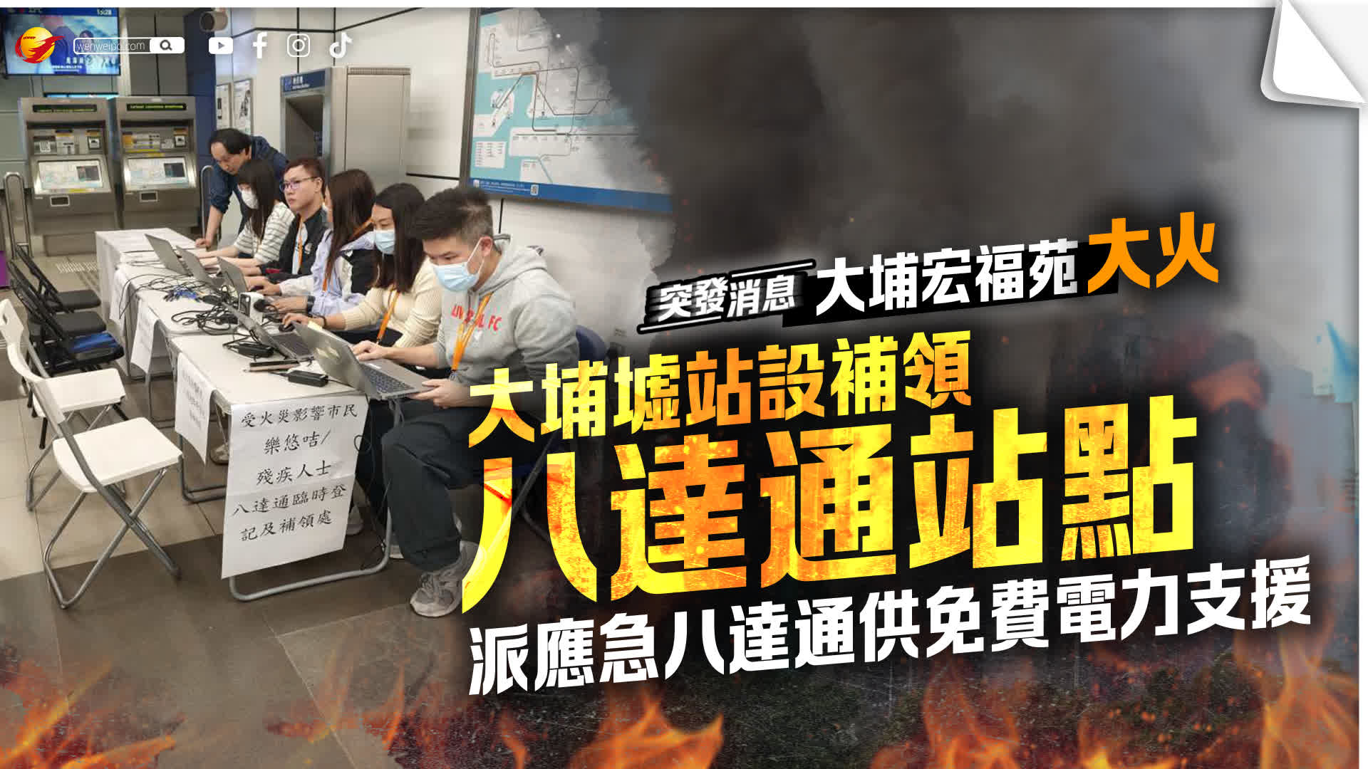 大埔宏福苑昨日(26日)發生五級火警,造成多人傷亡。至今,消防人員仍在進行滅火行動。地鐵大埔墟站已設置「受火災影響市民樂悠咭/殘疾人士八達通臨時登記及補貼領取處」,同時,該站點亦提供電力支援,包括提供免費充電服務及160小時免費租借充電寶。