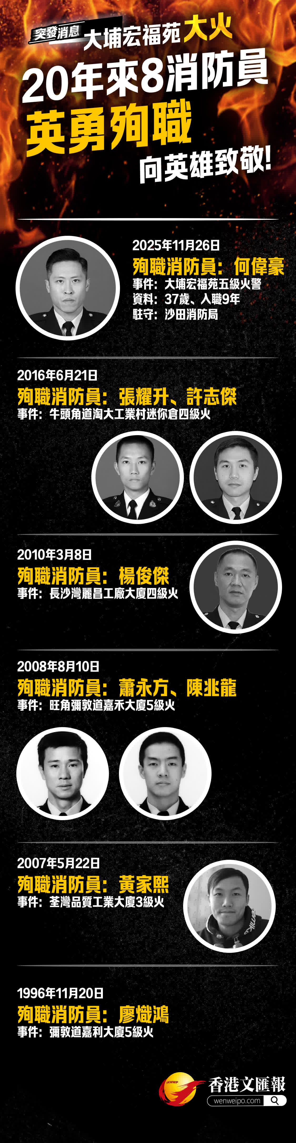 自1995年至今,本港已有至少8名消防人員在執行救火任務時英勇犧牲。