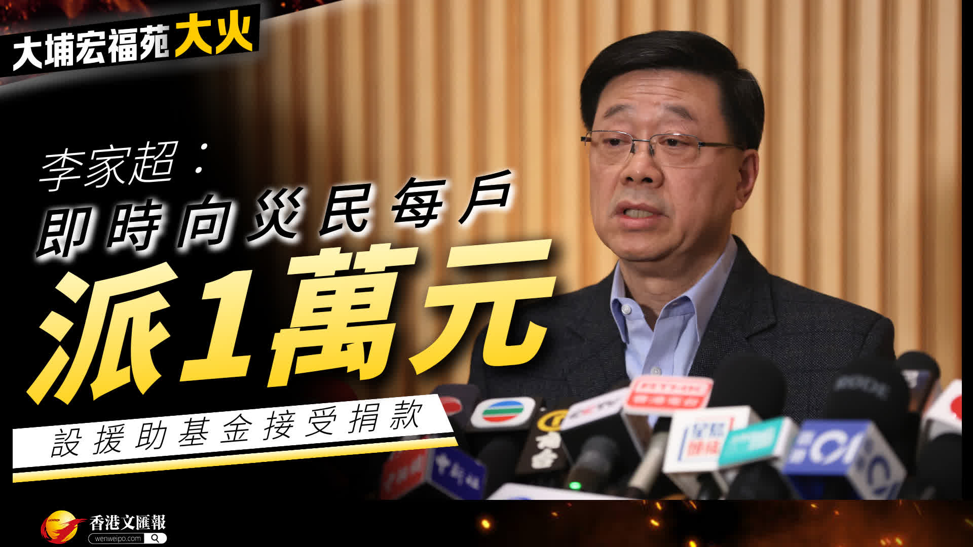 李家超表示,政府會投入3億元,為受影響的居民提供援助。政府已經設立了一個中銀香港的戶口,戶口號碼012-875-219-015-97,今晚7時起接受港元捐款,基金會用於幫助受影響居民。