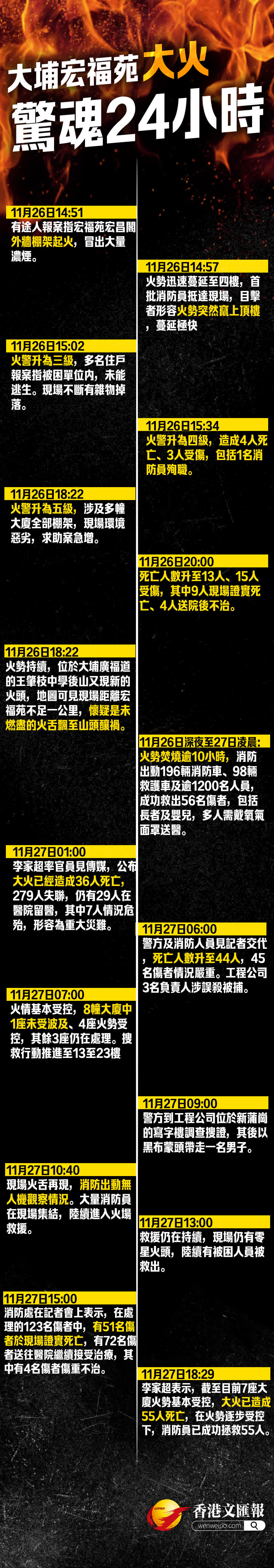 大埔宏福苑於2025年11月26日下午發生嚴重火警,火勢由外牆棚架蔓延至多幢住宅大廈,釀成嚴重死傷。一圖為你梳理事件主要時間線: