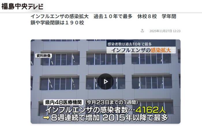 綜合日媒27日報道,日本福島縣流感疫情持續蔓延,感染人數達到了過去十年來的最高水平。