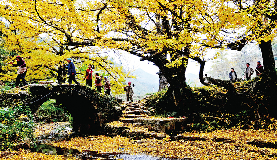 在「黔中第一奇景」開陽香火巖,冬季的峽谷因水質清澈而更顯幽深,兩岸的丹崖赤壁與尚未落盡的紅楓相映,碧水、赤壁、紅葉,構成一幅極具視覺衝擊力的油畫。冬日的盤州妥樂村,也正上演着最後的銀杏黃金盛宴。千餘株古銀杏樹將村落染成絢爛的金黃,落葉鋪滿小徑、石屋與溪流,漫步其中,彷彿走入一個被時光遺忘的童話。